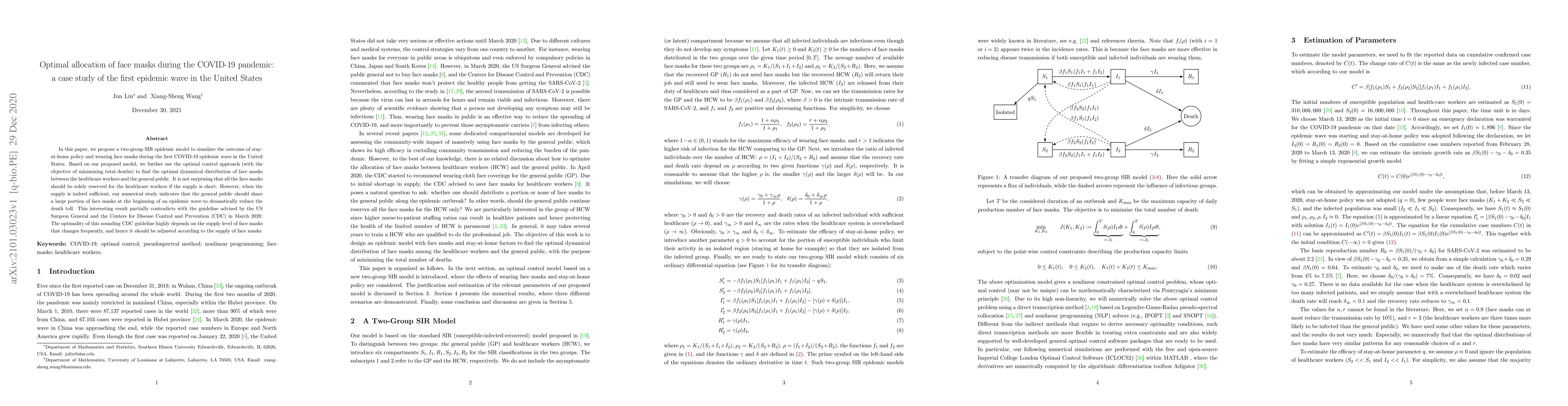In this paper, we propose a two-group SIR epidemic model to simulate the outcome of stay-at-home policy and wearing face masks during the first COVID-19 epidemic wave in the United States. Based on our proposed model, we further use the optimal control approach (with the objective of minimizing total deaths) to find the optimal dynamical distribution of face masks between the healthcare workers and the general public. It is not surprising that all the face masks should be solely reserved for the healthcare workers if the supply is short. However, when the supply is indeed sufficient, our numerical study indicates that the general public should share a large portion of face masks at the beginning of an epidemic wave to dramatically reduce the death toll. This interesting result partially contradicts with the guideline advised by the US Surgeon General and the Centers for Disease Control and Prevention (CDC) in March 2020. The optimality of this sounding CDC guideline highly depends on the supply level of face masks that changes frequently, and hence it should be adjusted according to the supply of face masks.
