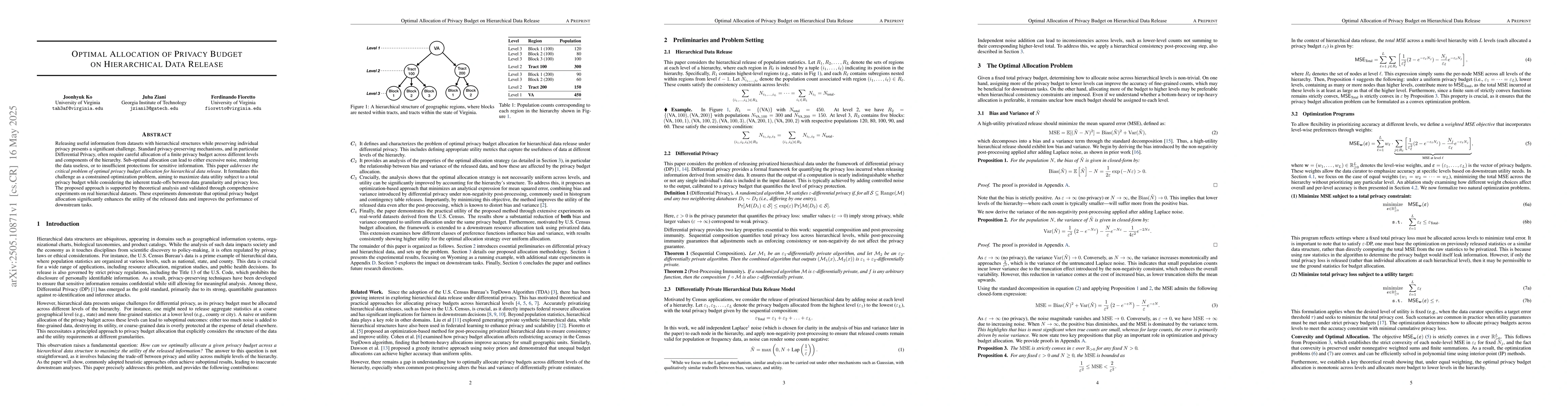 The paper presents an optimization framework for allocating privacy budgets in hierarchical data release, balancing utility and privacy.
