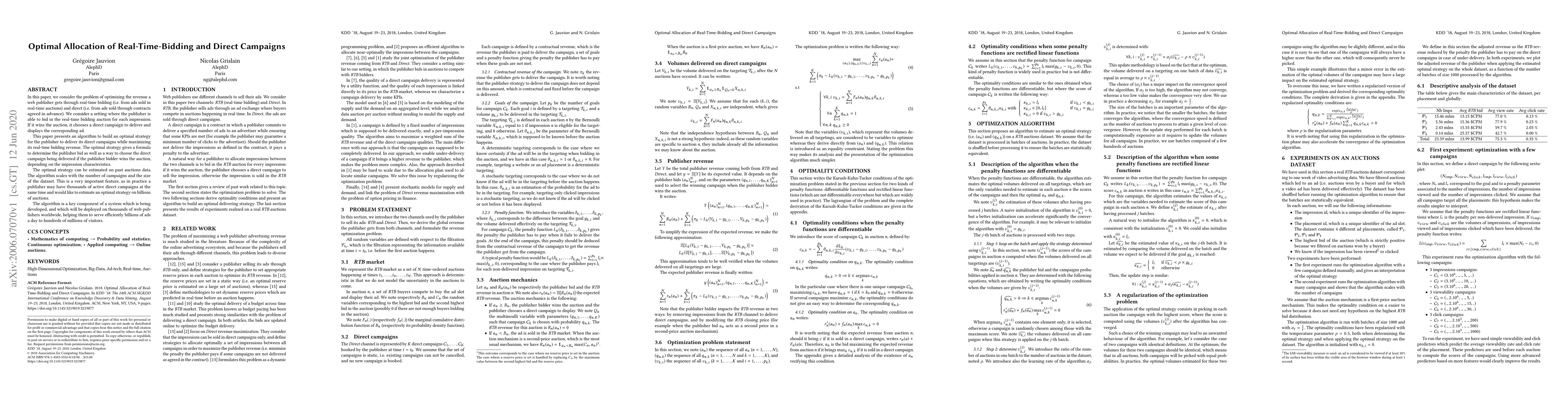 This paper proposes an algorithm to optimize a web publisher's revenue from real-time bidding and direct campaigns, providing a strategy to maximize real-time bidding revenue while selecting the best direct campaign if the auction is won. The scalable algorithm is designed to handle large datasets and numerous campaigns efficiently.