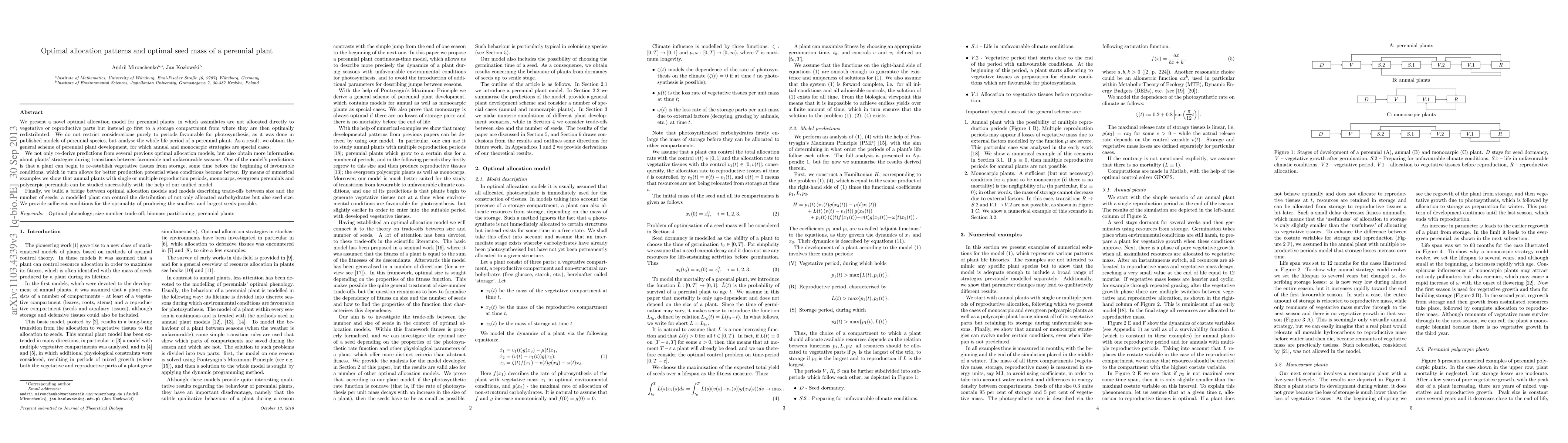 Researchers developed an optimal allocation model for perennial plants, allowing them to store assimilates and redistribute them during unfavorable seasons, leading to improved production potential. The model also considers seed size and provides conditions for optimality in seed production.
