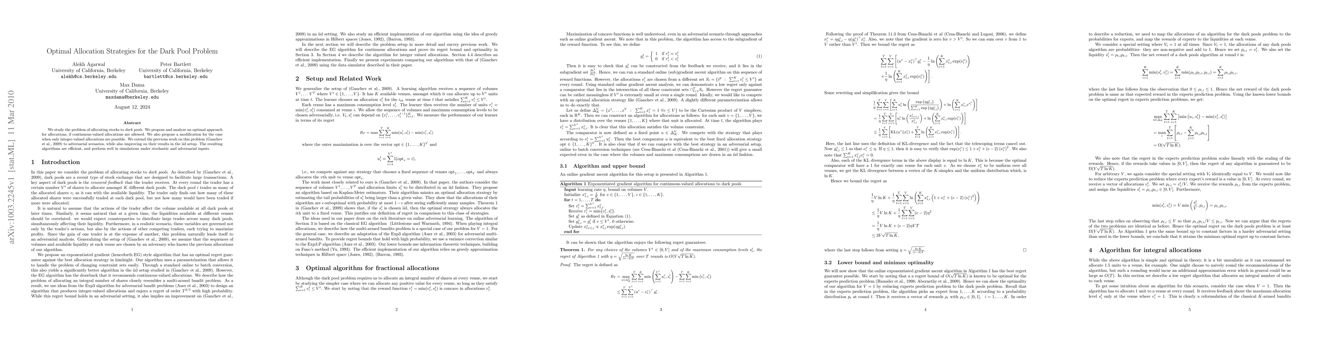We study the problem of allocating stocks to dark pools. We propose and analyze an optimal approach for allocations, if continuous-valued allocations are allowed. We also propose a modification for the case when only integer-valued allocations are possible. We extend the previous work on this problem to adversarial scenarios, while also improving on their results in the iid setup. The resulting algorithms are efficient, and perform well in simulations under stochastic and adversarial inputs.