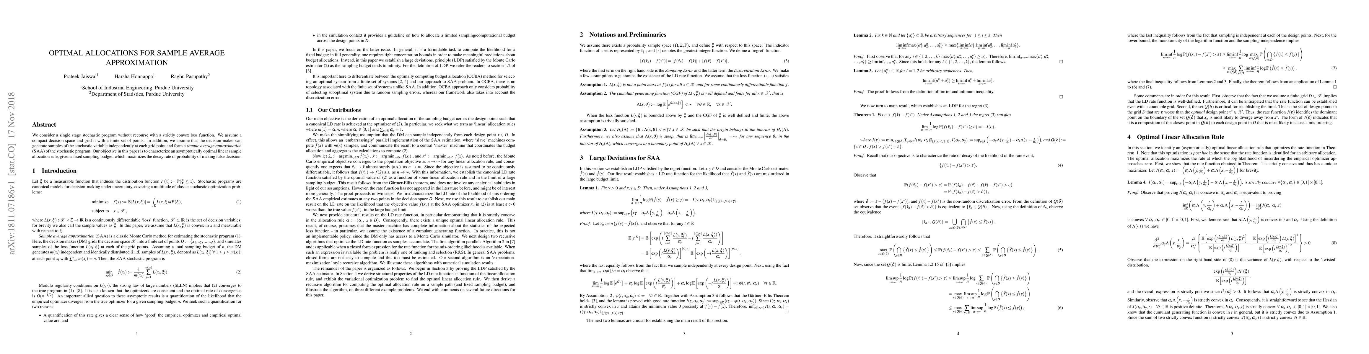 We consider a single stage stochastic program without recourse with a strictly convex loss function. We assume a compact decision space and grid it with a finite set of points. In addition, we assume that the decision maker can generate samples of the stochastic variable independently at each grid point and form a sample average approximation (SAA) of the stochastic program. Our objective in this paper is to characterize an asymptotically optimal linear sample allocation rule, given a fixed sampling budget, which maximizes the decay rate of probability of making false decision.