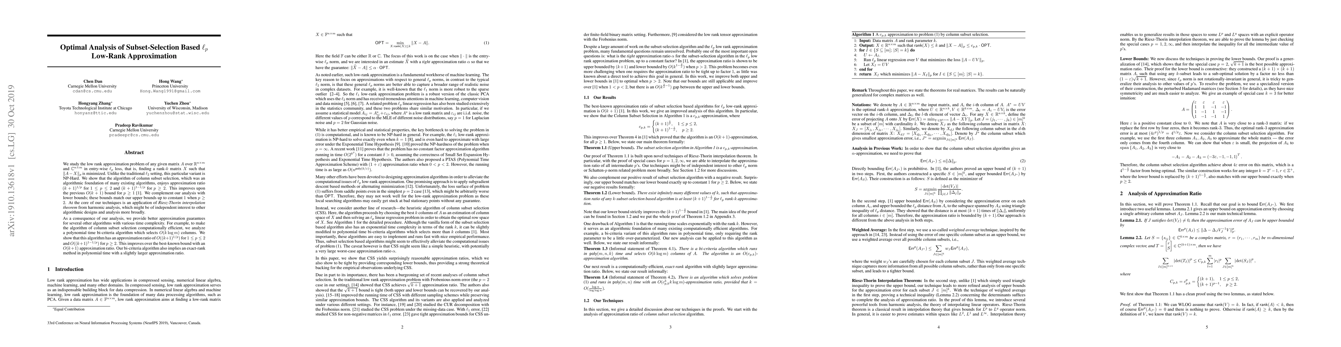 We study the low rank approximation problem of any given matrix $A$ over $\mathbb{R}^{n\times m}$ and $\mathbb{C}^{n\times m}$ in entry-wise $\ell_p$ loss, that is, finding a rank-$k$ matrix $X$ such that $\|A-X\|_p$ is minimized. Unlike the traditional $\ell_2$ setting, this particular variant is NP-Hard. We show that the algorithm of column subset selection, which was an algorithmic foundation of many existing algorithms, enjoys approximation ratio $(k+1)^{1/p}$ for $1\le p\le 2$ and $(k+1)^{1-1/p}$ for $p\ge 2$. This improves upon the previous $O(k+1)$ bound for $p\ge 1$ \cite{chierichetti2017algorithms}. We complement our analysis with lower bounds; these bounds match our upper bounds up to constant $1$ when $p\geq 2$. At the core of our techniques is an application of \emph{Riesz-Thorin interpolation theorem} from harmonic analysis, which might be of independent interest to other algorithmic designs and analysis more broadly. As a consequence of our analysis, we provide better approximation guarantees for several other algorithms with various time complexity. For example, to make the algorithm of column subset selection computationally efficient, we analyze a polynomial time bi-criteria algorithm which selects $O(k\log m)$ columns. We show that this algorithm has an approximation ratio of $O((k+1)^{1/p})$ for $1\le p\le 2$ and $O((k+1)^{1-1/p})$ for $p\ge 2$. This improves over the best-known bound with an $O(k+1)$ approximation ratio. Our bi-criteria algorithm also implies an exact-rank method in polynomial time with a slightly larger approximation ratio.