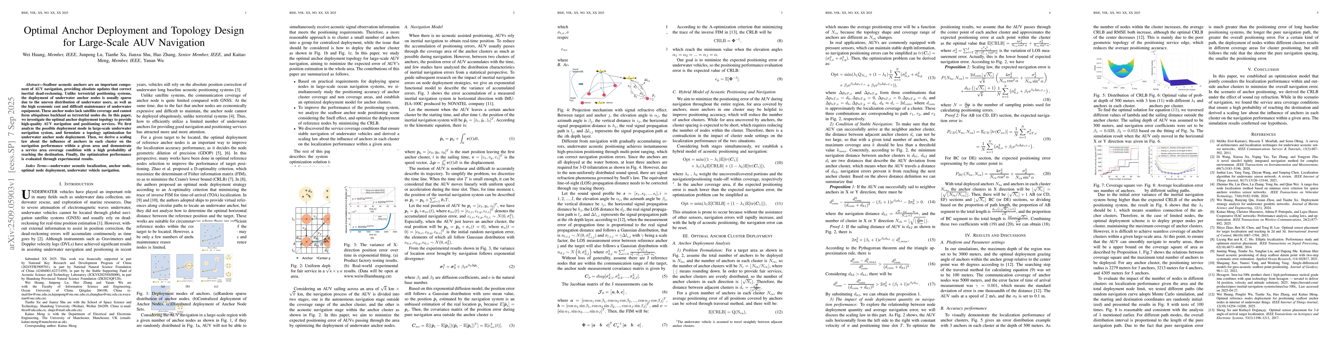 Seafloor acoustic anchors are an important component of AUV navigation, providing absolute updates that correct inertial dead-reckoning. Unlike terrestrial positioning systems, the deployment of underwater anchor nodes is usually sparse due to the uneven distribution of underwater users, as well as the high economic cost and difficult maintenance of underwater equipment. These anchor nodes lack satellite coverage and cannot form ubiquitous backhaul as terrestrial nodes do. In this paper, we investigate the optimal anchor deployment topology to provide high-quality AUV navigation and positioning services. We first analyze the possible deployment mode in large-scale underwater navigation system, and formulate a topology optimization for underwater anchor node deployment. Then, we derive a scaling law about the influence of anchors in each cluster on the navigation performance within a given area and demonstrate a service area coverage condition with a high probability of reaching the destination. Finally, the optimization performance is evaluated through experimental results.