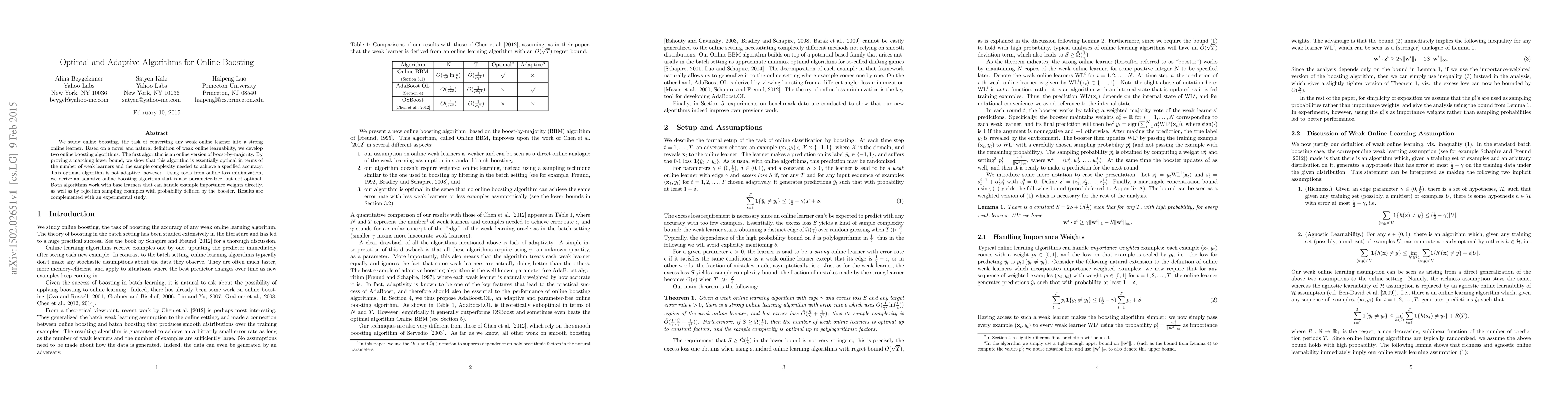 This paper develops two online boosting algorithms to enhance weak online learners into strong ones. The first is an optimal, non-adaptive version based on boost-by-majority, while the second is an adaptive, parameter-free algorithm, though not optimal. Both algorithms efficiently handle example importance weights and rejection sampling.