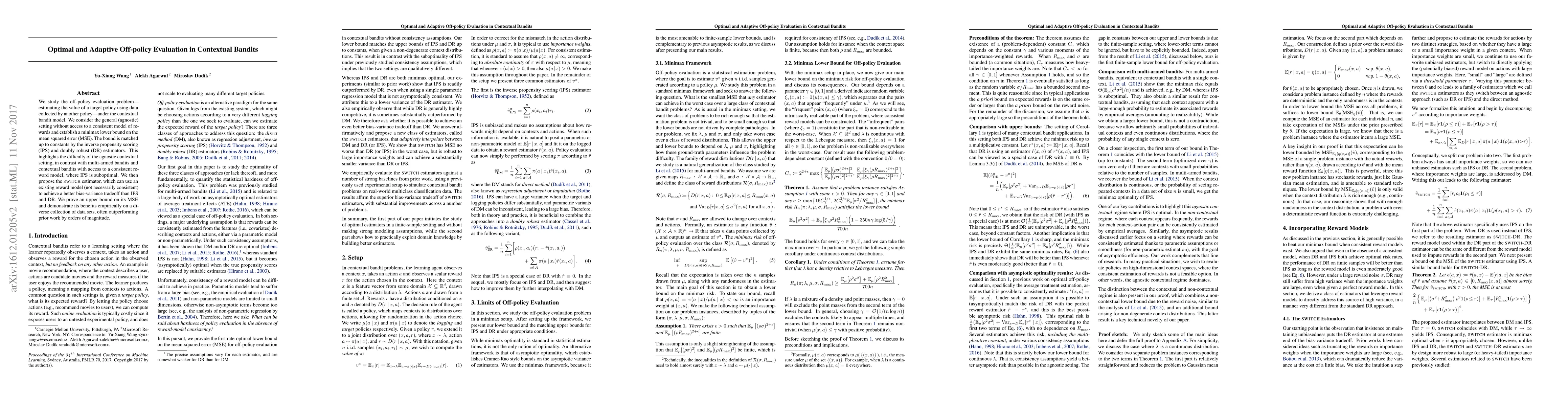 This paper addresses the off-policy evaluation problem in contextual bandits, establishing a minimax lower bound on mean squared error and showing that inverse propensity scoring and doubly robust estimators match this bound. It introduces the SWITCH estimator, which leverages an existing reward model to outperform these estimators, demonstrating significant improvements in empirical evaluations.