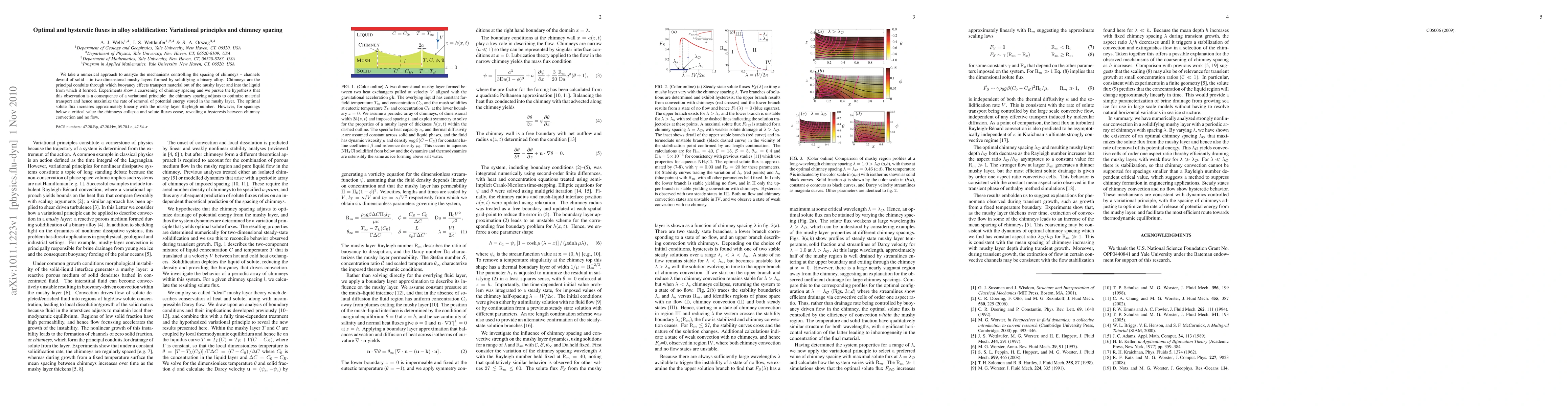 This paper numerically investigates the spacing of chimneys in solidifying binary alloys, proposing that chimney spacing optimizes material transport to maximize potential energy removal. It finds a linear relationship between optimal solute flux and the Rayleigh number, but identifies hysteresis where chimneys collapse below a critical spacing, ceasing solute fluxes.