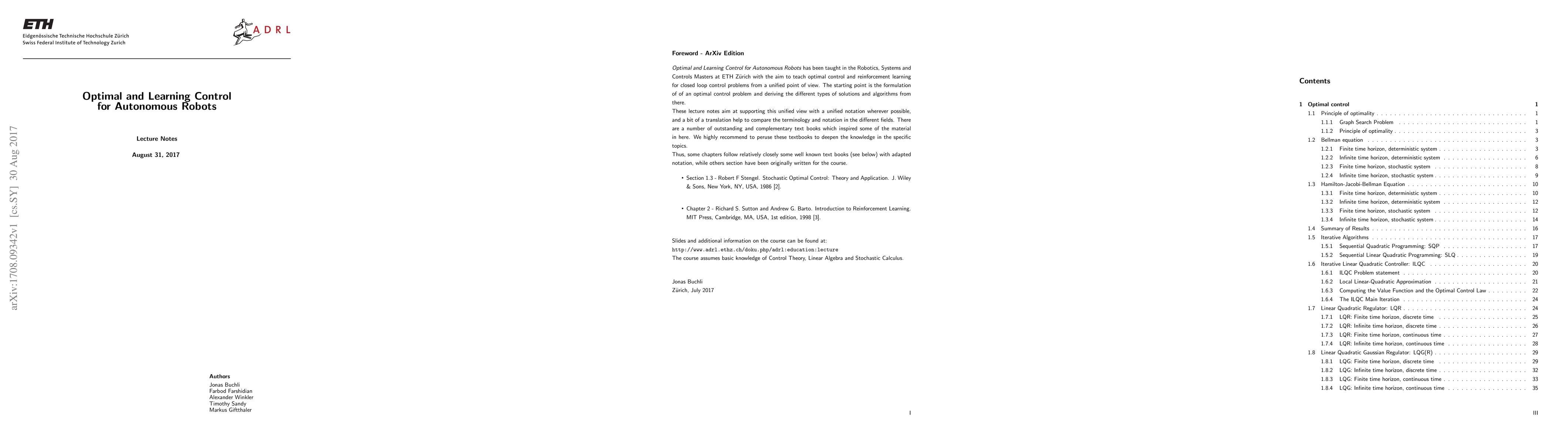 Optimal and Learning Control for Autonomous Robots has been taught in the Robotics, Systems and Controls Masters at ETH Zurich with the aim to teach optimal control and reinforcement learning for closed loop control problems from a unified point of view. The starting point is the formulation of of an optimal control problem and deriving the different types of solutions and algorithms from there. These lecture notes aim at supporting this unified view with a unified notation wherever possible, and a bit of a translation help to compare the terminology and notation in the different fields. The course assumes basic knowledge of Control Theory, Linear Algebra and Stochastic Calculus.