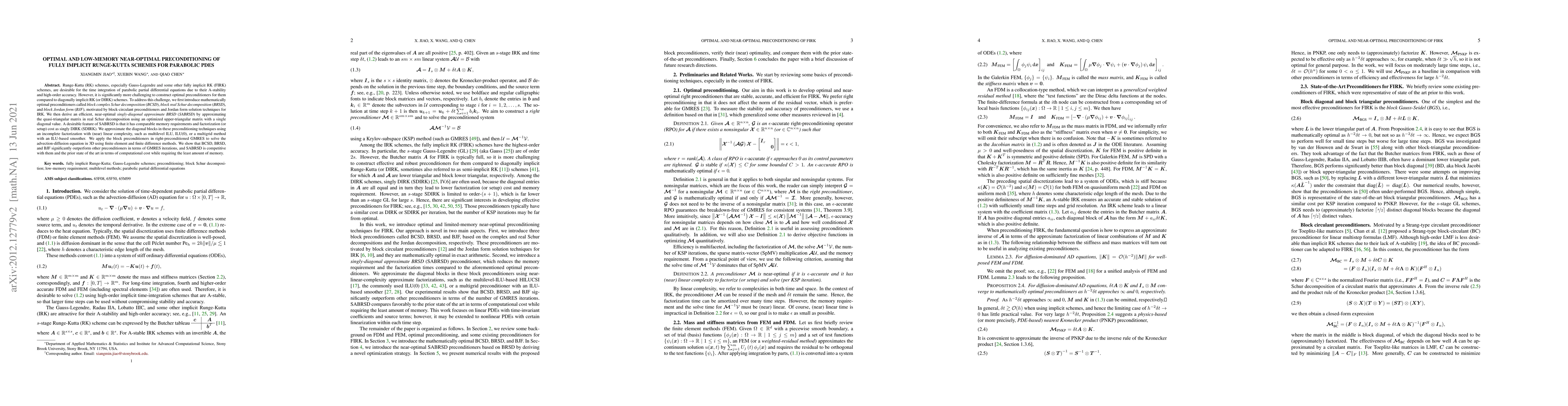 This paper introduces optimal and near-optimal preconditioners for fully implicit Runge-Kutta schemes used in solving parabolic PDEs, specifically Gauss-Legendre and other FIRK schemes. The study proposes block complex Schur decomposition, block real Schur decomposition, and block Jordan form preconditioners, alongside a near-optimal singly-diagonal approximate BRSD with low memory and comparable computational cost to singly DIRK.