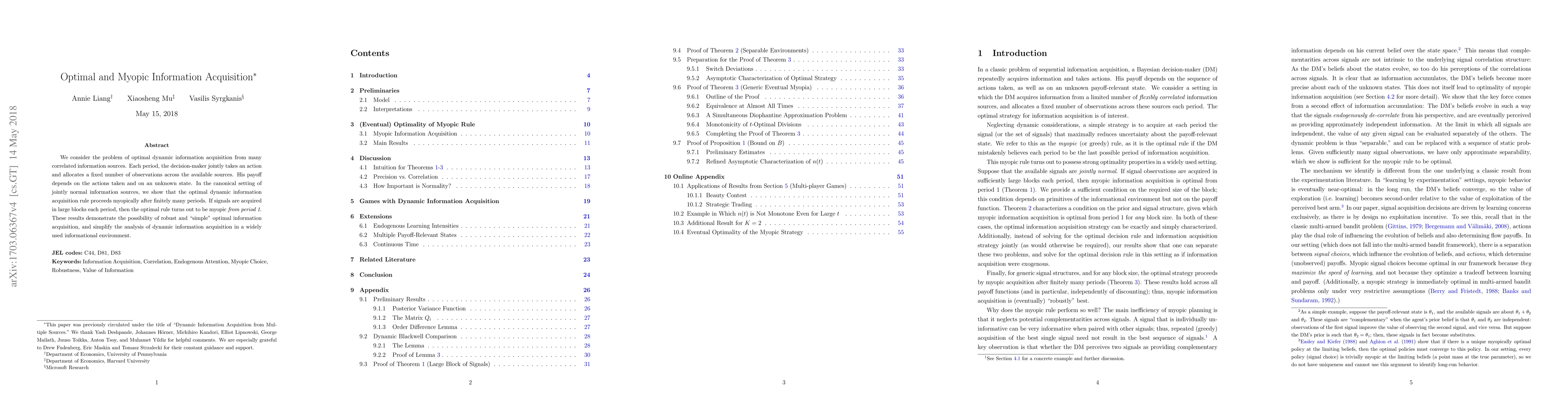 We consider the problem of optimal dynamic information acquisition from many correlated information sources. Each period, the decision-maker jointly takes an action and allocates a fixed number of observations across the available sources. His payoff depends on the actions taken and on an unknown state. In the canonical setting of jointly normal information sources, we show that the optimal dynamic information acquisition rule proceeds myopically after finitely many periods. If signals are acquired in large blocks each period, then the optimal rule turns out to be myopic from period 1. These results demonstrate the possibility of robust and "simple" optimal information acquisition, and simplify the analysis of dynamic information acquisition in a widely used informational environment.