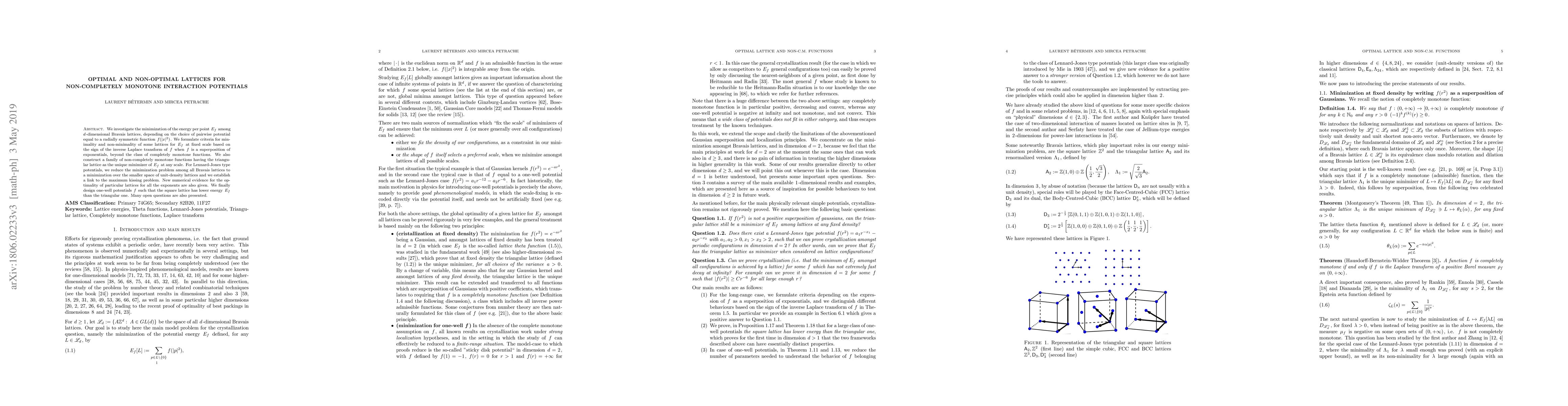 This paper explores the minimization of energy per point $E_f$ among $d$-dimensional Bravais lattices for non-completely monotone interaction potentials. It identifies criteria for lattice optimality based on the inverse Laplace transform of $f$ and constructs non-completely monotone functions where the triangular lattice is the unique minimizer.