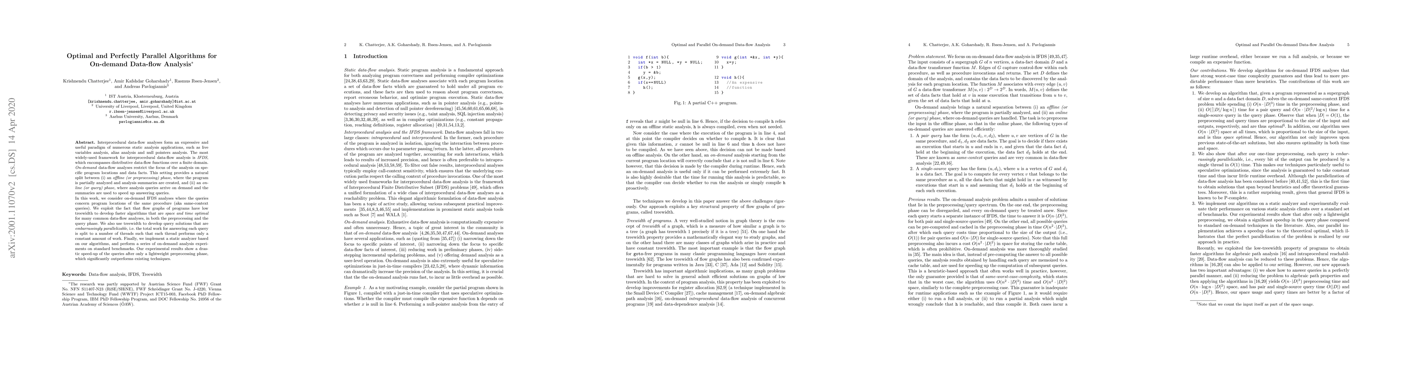 This paper develops optimal and parallel algorithms for on-demand interprocedural data-flow analyses, leveraging low treewidth in program flow graphs to achieve both time and space efficiency. The proposed algorithms are shown to drastically speed up query responses in a static analyzer, outperforming existing techniques.