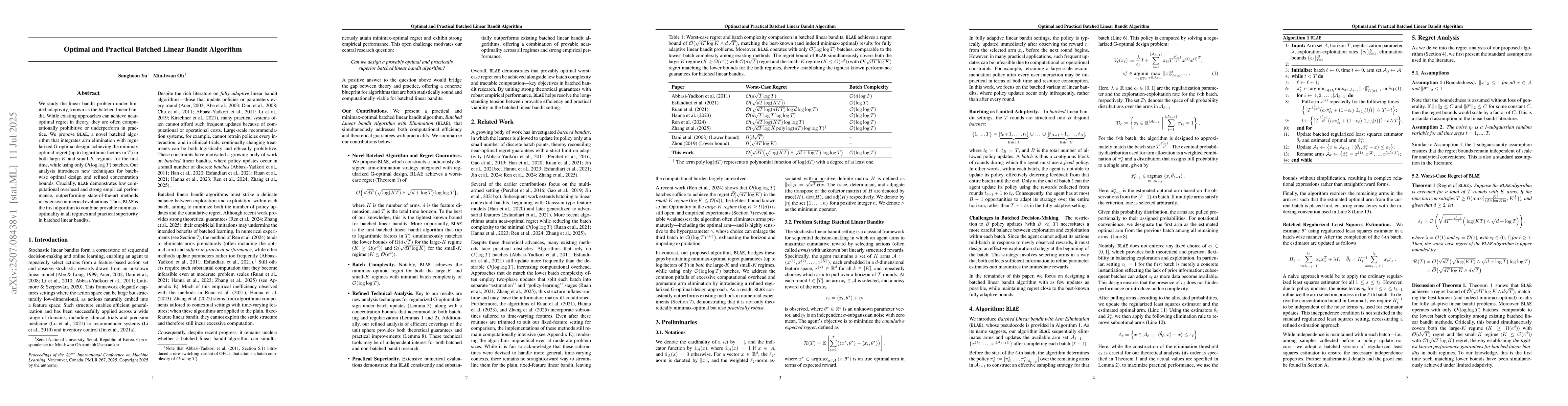 We study the linear bandit problem under limited adaptivity, known as the batched linear bandit. While existing approaches can achieve near-optimal regret in theory, they are often computationally prohibitive or underperform in practice. We propose \texttt{BLAE}, a novel batched algorithm that integrates arm elimination with regularized G-optimal design, achieving the minimax optimal regret (up to logarithmic factors in $T$) in both large-$K$ and small-$K$ regimes for the first time, while using only $O(\log\log T)$ batches. Our analysis introduces new techniques for batch-wise optimal design and refined concentration bounds. Crucially, \texttt{BLAE} demonstrates low computational overhead and strong empirical performance, outperforming state-of-the-art methods in extensive numerical evaluations. Thus, \texttt{BLAE} is the first algorithm to combine provable minimax-optimality in all regimes and practical superiority in batched linear bandits.