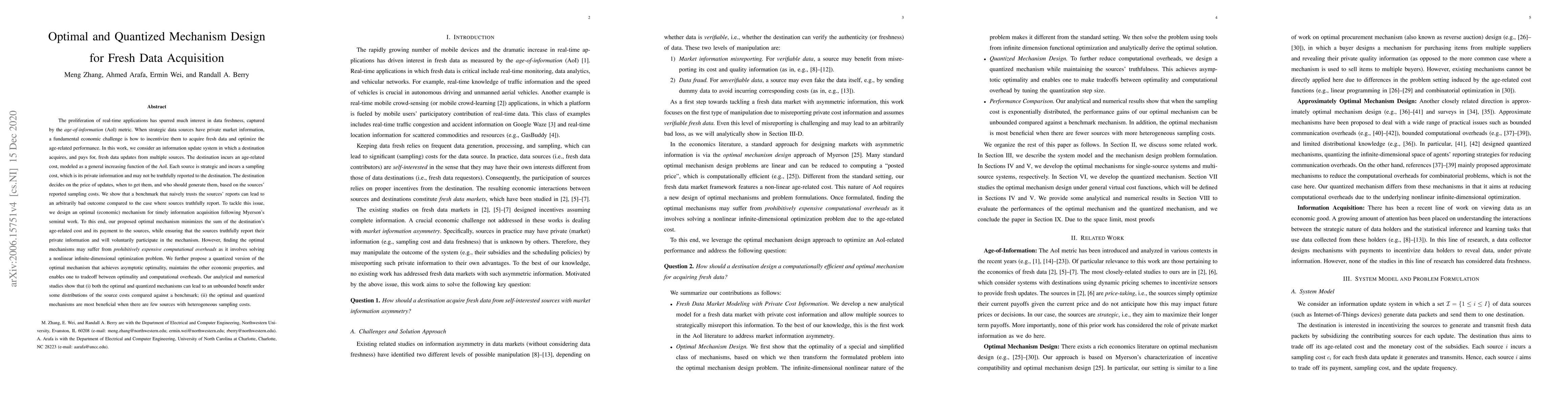 The proliferation of real-time applications has spurred much interest in data freshness, captured by the {\it age-of-information} (AoI) metric. When strategic data sources have private market information, a fundamental economic challenge is how to incentivize them to acquire fresh data and optimize the age-related performance. In this work, we consider an information update system in which a destination acquires, and pays for, fresh data updates from multiple sources. The destination incurs an age-related cost, modeled as a general increasing function of the AoI. Each source is strategic and incurs a sampling cost, which is its private information and may not be truthfully reported to the destination. The destination decides on the price of updates, when to get them, and who should generate them, based on the sources' reported sampling costs. We show that a benchmark that naively trusts the sources' reports can lead to an arbitrarily bad outcome compared to the case where sources truthfully report. To tackle this issue, we design an optimal (economic) mechanism for timely information acquisition following Myerson's seminal work. To this end, our proposed optimal mechanism minimizes the sum of the destination's age-related cost and its payment to the sources, while ensuring that the sources truthfully report their private information and will voluntarily participate in the mechanism. However, finding the optimal mechanisms may suffer from \textit{prohibitively expensive computational overheads} as it involves solving a nonlinear infinite-dimensional optimization problem. We further propose a quantized version of the optimal mechanism that achieves asymptotic optimality, maintains the other economic properties, and enables one to tradeoff between optimality and computational overheads.