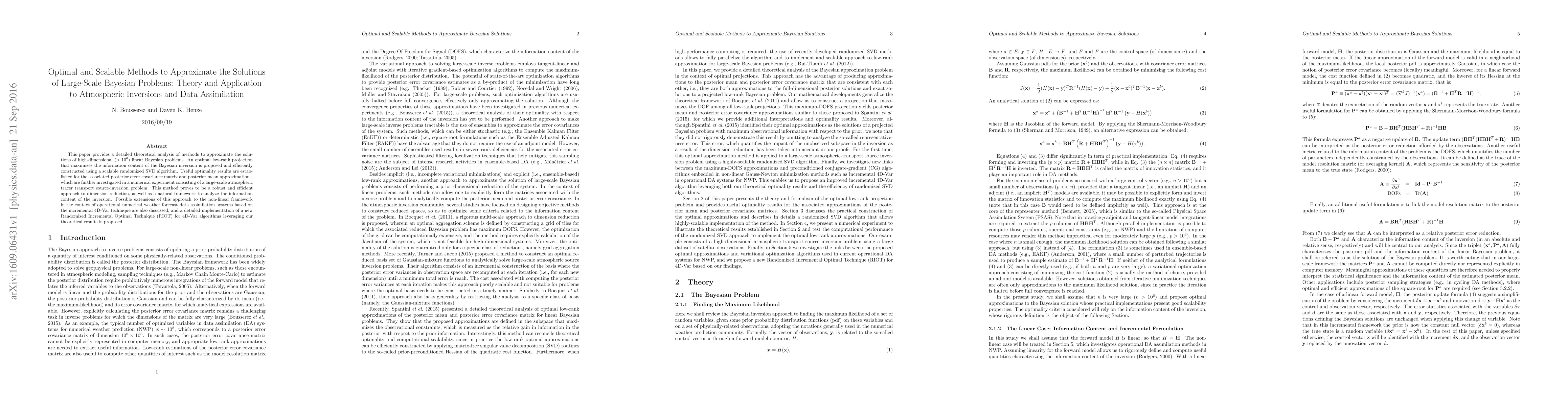 This paper provides a detailed theoretical analysis of methods to approximate the solutions of high-dimensional (>10^6) linear Bayesian problems. An optimal low-rank projection that maximizes the information content of the Bayesian inversion is proposed and efficiently constructed using a scalable randomized SVD algorithm. Useful optimality results are established for the associated posterior error covariance matrix and posterior mean approximations, which are further investigated in a numerical experiment consisting of a large-scale atmospheric tracer transport source-inversion problem. This method proves to be a robust and efficient approach to dimension reduction, as well as a natural framework to analyze the information content of the inversion. Possible extensions of this approach to the non-linear framework in the context of operational numerical weather forecast data assimilation systems based on the incremental 4D-Var technique are also discussed, and a detailed implementation of a new Randomized Incremental Optimal Technique (RIOT) for 4D-Var algorithms leveraging our theoretical results is proposed.