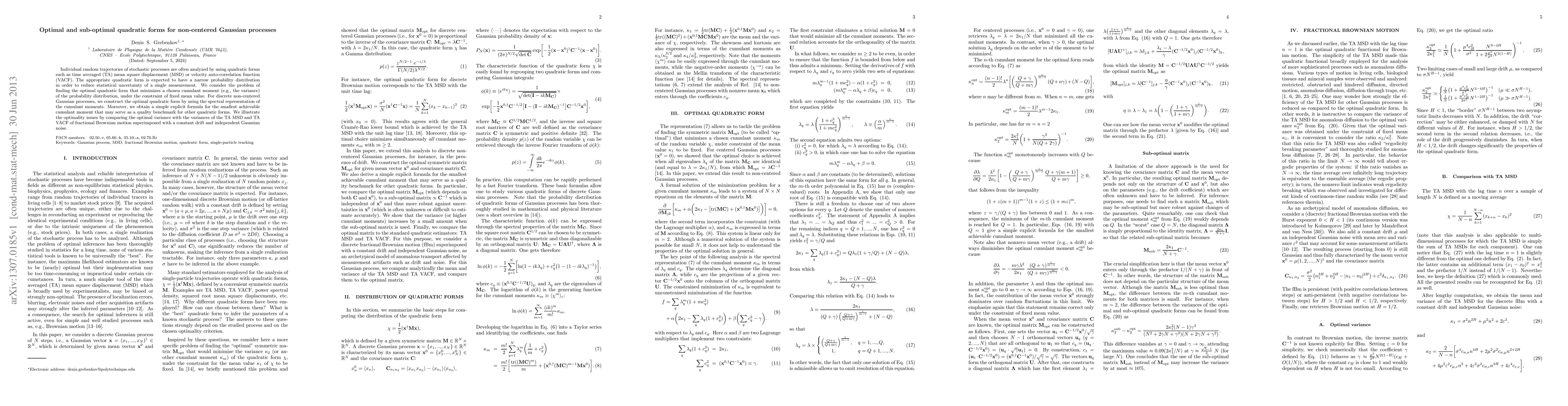 This paper investigates the optimal quadratic forms for analyzing discrete non-centered Gaussian processes, focusing on minimizing the variance of the probability distribution under a fixed mean constraint. It provides an explicit formula for the smallest achievable variance and compares it with the variances of common quadratic forms like time averaged mean square displacement and velocity auto-correlation function.
