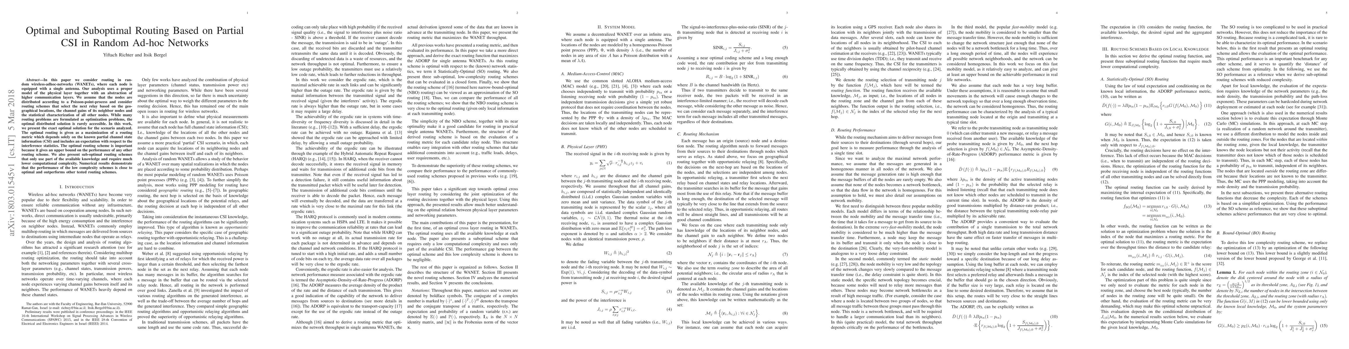 In this paper we consider routing in random wireless-adhoc-networks (WANETs), where each node is equipped with a single antenna. Our analysis uses a proper model of the physical layer together with an abstraction of higher communication layers. We assume that the nodes are distributed according to a Poisson-point-process and consider routing schemes that select the next relay based on the geographical locations, the channel gains of its neighbor nodes and the statistical characterization of all other nodes. While many routing problems are formulated as optimization problems, the optimal distributed solution is rarely accessible. In this work, we present the exact optimal solution for the scenario analyzed. The optimal routing is given as a maximization of a routing metric which depends solely on the known partial channel state information (CSI) and includes an expectation with respect to the interference statistics. The optimal routing scheme is important because it gives an upper bound on the performance of any other routing scheme. We also present sub-optimal routing schemes that only use part of the available knowledge and require much lower computational complexity. Numerical results demonstrate that the performance of the low complexity schemes is close to optimal and outperforms other tested routing schemes.