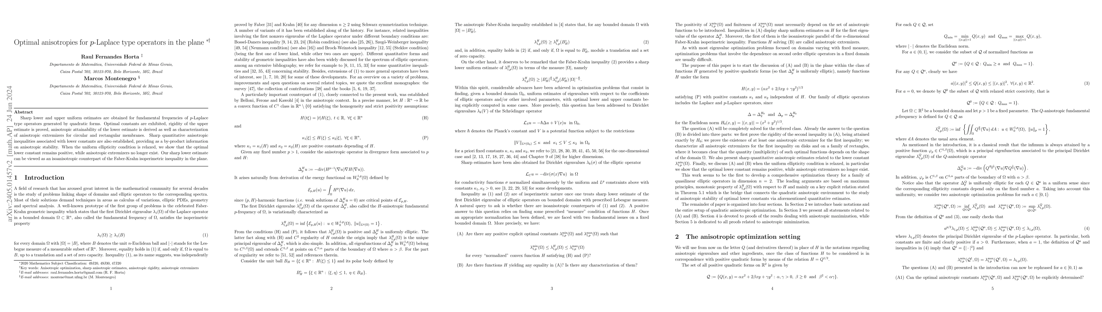 Sharp lower and upper uniform estimates are obtained for fundamental frequencies of $p$-Laplace type operators generated by quadratic forms. Optimal constants are exhibited, rigidity of the upper estimate is proved, anisotropic attainability of the lower estimate is derived as well as characterization of anisotropic extremizers for circular and rectangular membranes. Sharp quantitative anisotropic inequalities associated with lower constants are also established, providing as a by-product information on anisotropic stability. When the uniform ellipticity condition is relaxed, we show that the optimal lower constant remains positive, while anisotropic extremizers no longer exist. Our sharp lower estimate can be viewed as an isoanisotropic counterpart of the Faber-Krahn isoperimetric inequality in the plane.