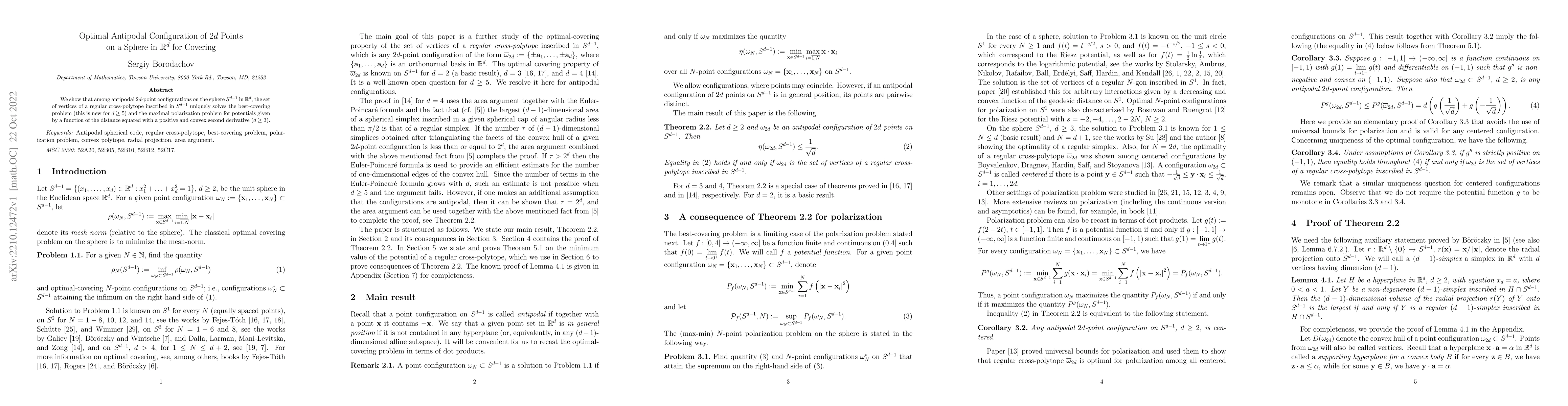 We show that among antipodal $2d$-point configurations on the sphere $S^{d-1}$ in $\mathbb R^d$, the set of vertices of a regular cross-polytope inscribed in $S^{d-1}$ uniquely solves the best-covering problem (this is new for $d\geq 5$) and the maximal polarization problem for potentials given by a function of the distance squared with a positive and convex second derivative ($d\geq 3$).