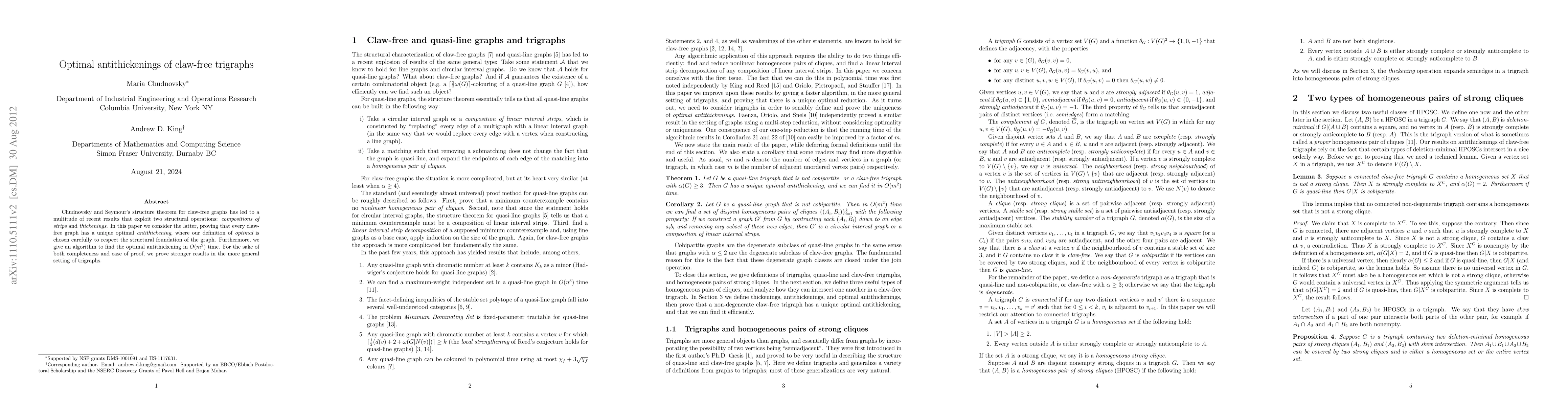 This paper proves that every claw-free graph has a unique optimal antithickening, respecting the structural foundation of the graph, and provides an algorithm to find it in $O(m^2)$ time. The results are extended to the more general setting of trigraphs for completeness and ease of proof.
