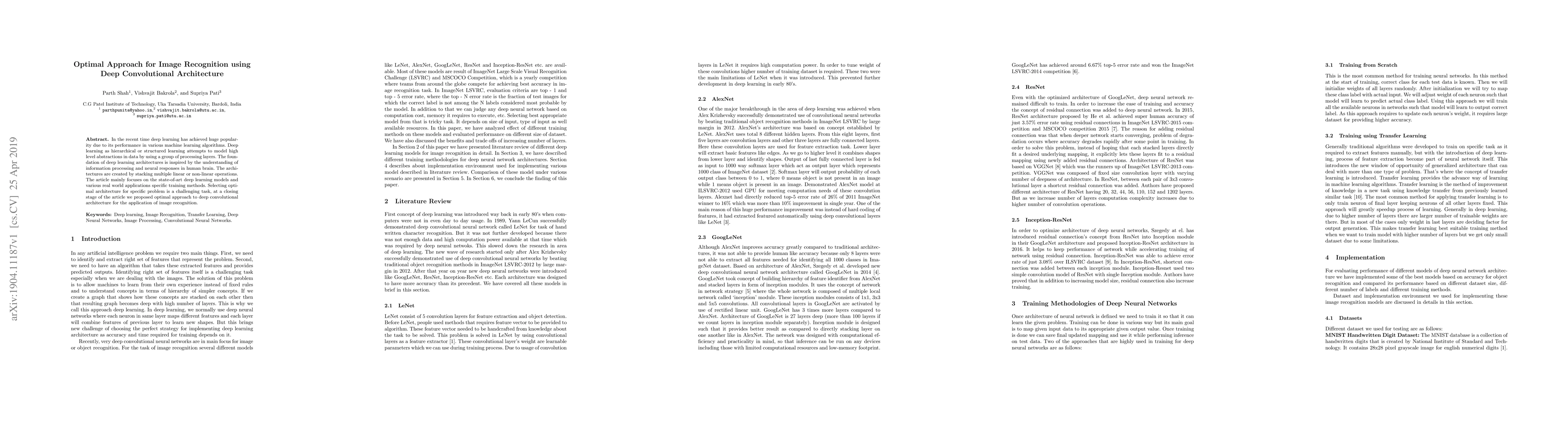 In the recent time deep learning has achieved huge popularity due to its performance in various machine learning algorithms. Deep learning as hierarchical or structured learning attempts to model high level abstractions in data by using a group of processing layers. The foundation of deep learning architectures is inspired by the understanding of information processing and neural responses in human brain. The architectures are created by stacking multiple linear or non-linear operations. The article mainly focuses on the state-of-art deep learning models and various real world applications specific training methods. Selecting optimal architecture for specific problem is a challenging task, at a closing stage of the article we proposed optimal approach to deep convolutional architecture for the application of image recognition.