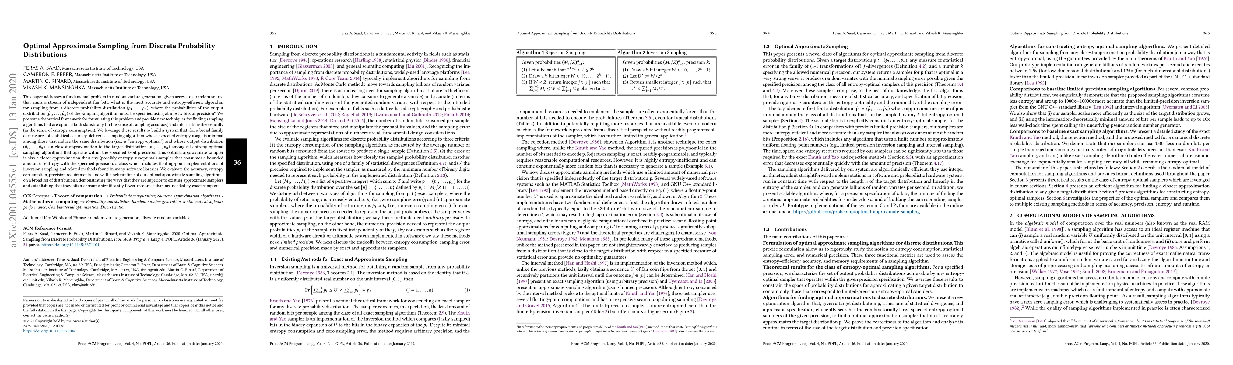 This paper develops an optimal approximate sampling algorithm for discrete probability distributions, achieving minimal entropy usage while maintaining high statistical accuracy, outperforming existing methods in both precision and resource efficiency. The proposed framework ensures the output distribution is the closest approximation within specified bit precision, demonstrating superior performance across various distributions.