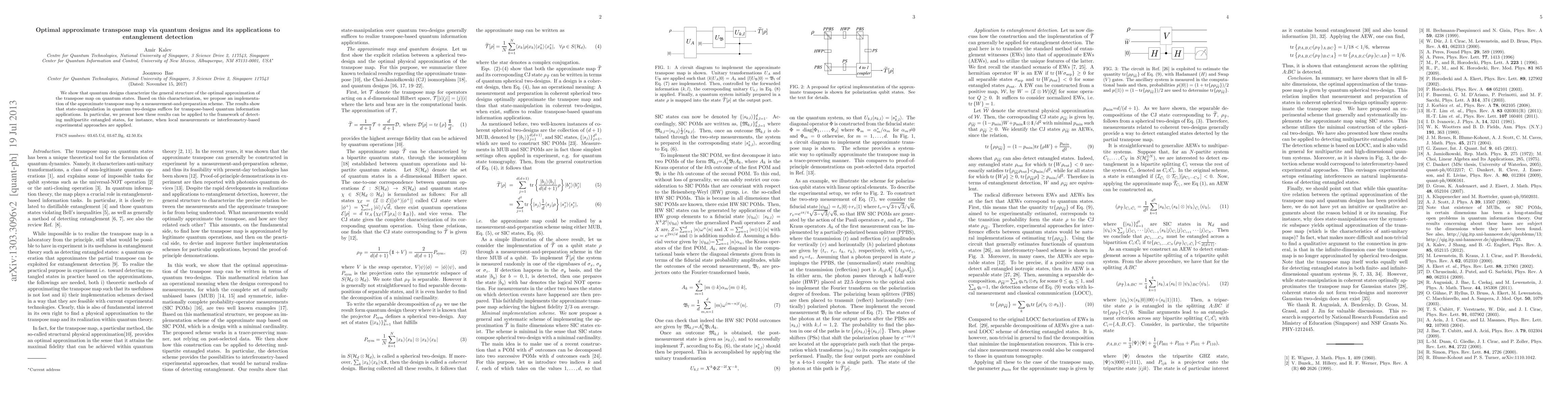 We show that quantum designs characterize the general structure of the optimal approximation of the transpose map on quantum states. Based on this characterization, we propose an implementation of the approximate transpose map by a measurement-and-preparation scheme. The results show that state-manipulation in quantum two-designs suffices for transpose-based quantu3 information applications. In particular, we present how these results can be applied to the framework of detecting multipartite entangled states, for instance, when local measurements or interferometry-based experimental approaches are applied.