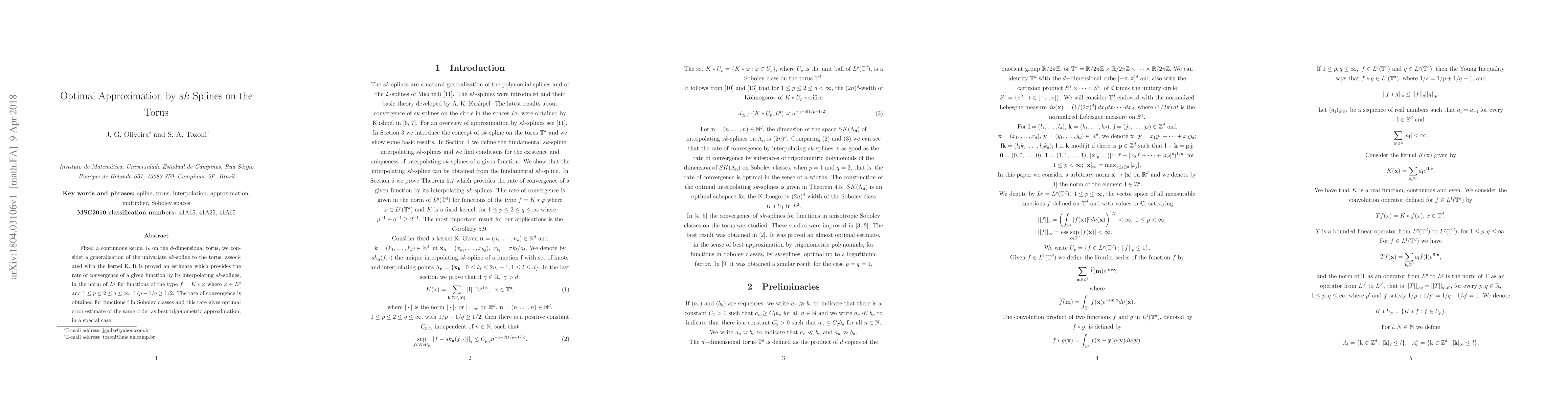 Fixed a continuous kernel K on the $d$-dimensional torus, we consider a generalization of the univariate $sk$-spline to the torus, associated with the kernel K. It is proved an estimate which provides the rate of convergence of a given function by its interpolating $sk$-splines, in the norm of $L^q$ for functions of the type $f=K*\varphi$ where $\varphi \in L^p$ and $1\leq p \leq 2 \leq q \leq \infty,\ 1/p - 1/q \geq 1/2$. The rate of convergence is obtained for functions f in Sobolev classes and this rate gives optimal error estimate of the same order as best trigonometric approximation, in a special case.