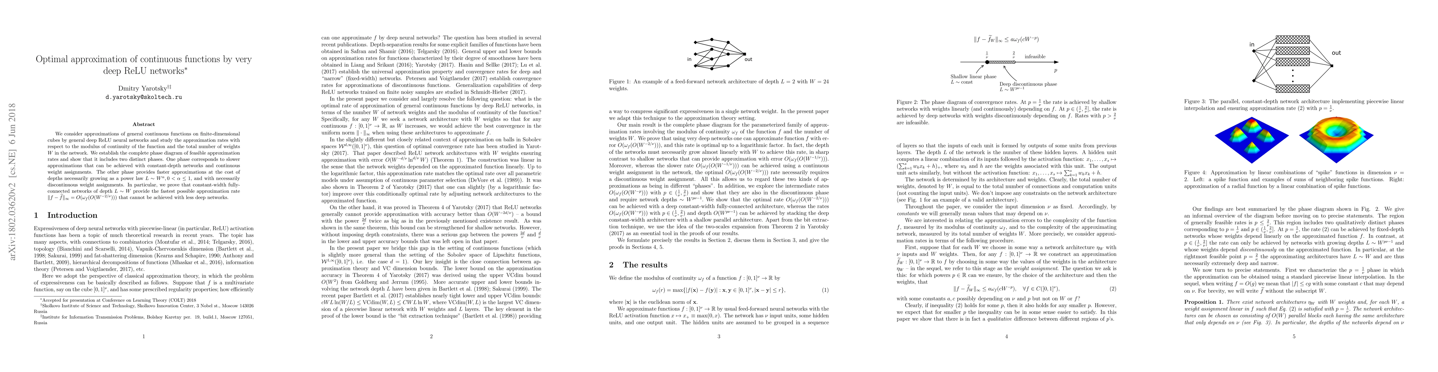 This paper investigates the optimal approximation of continuous functions by deep ReLU networks, establishing a phase diagram of feasible approximation rates. It finds that faster approximations require networks with depth growing as a power law and discontinuous weight assignments, while constant-depth networks provide slower but simpler approximations.