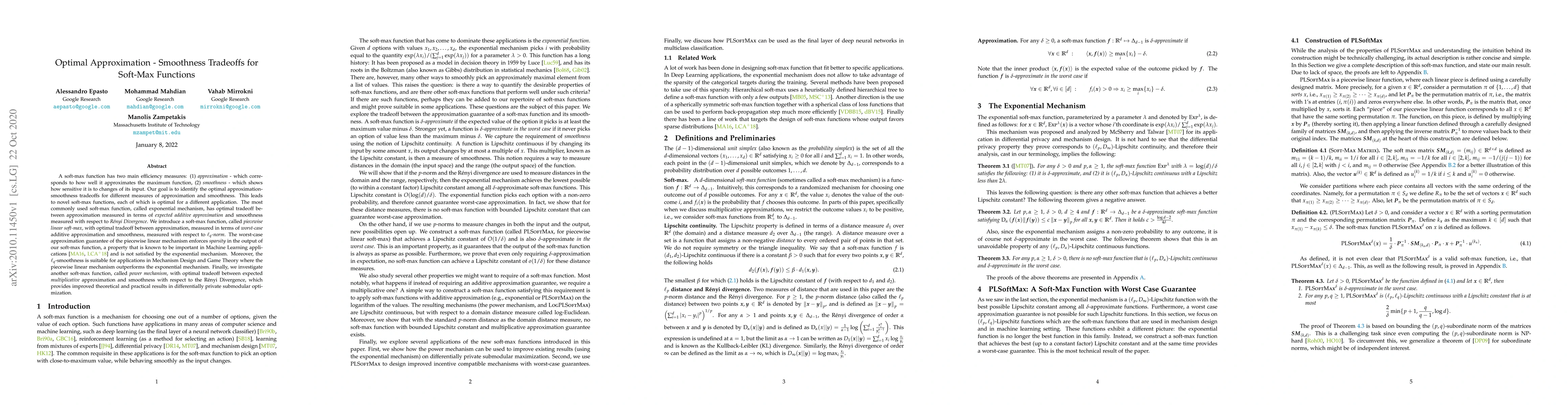 A soft-max function has two main efficiency measures: (1) approximation - which corresponds to how well it approximates the maximum function, (2) smoothness - which shows how sensitive it is to changes of its input. Our goal is to identify the optimal approximation-smoothness tradeoffs for different measures of approximation and smoothness. This leads to novel soft-max functions, each of which is optimal for a different application. The most commonly used soft-max function, called exponential mechanism, has optimal tradeoff between approximation measured in terms of expected additive approximation and smoothness measured with respect to R\'enyi Divergence. We introduce a soft-max function, called "piecewise linear soft-max", with optimal tradeoff between approximation, measured in terms of worst-case additive approximation and smoothness, measured with respect to $\ell_q$-norm. The worst-case approximation guarantee of the piecewise linear mechanism enforces sparsity in the output of our soft-max function, a property that is known to be important in Machine Learning applications [Martins et al. '16, Laha et al. '18] and is not satisfied by the exponential mechanism. Moreover, the $\ell_q$-smoothness is suitable for applications in Mechanism Design and Game Theory where the piecewise linear mechanism outperforms the exponential mechanism. Finally, we investigate another soft-max function, called power mechanism, with optimal tradeoff between expected \textit{multiplicative} approximation and smoothness with respect to the R\'enyi Divergence, which provides improved theoretical and practical results in differentially private submodular optimization.