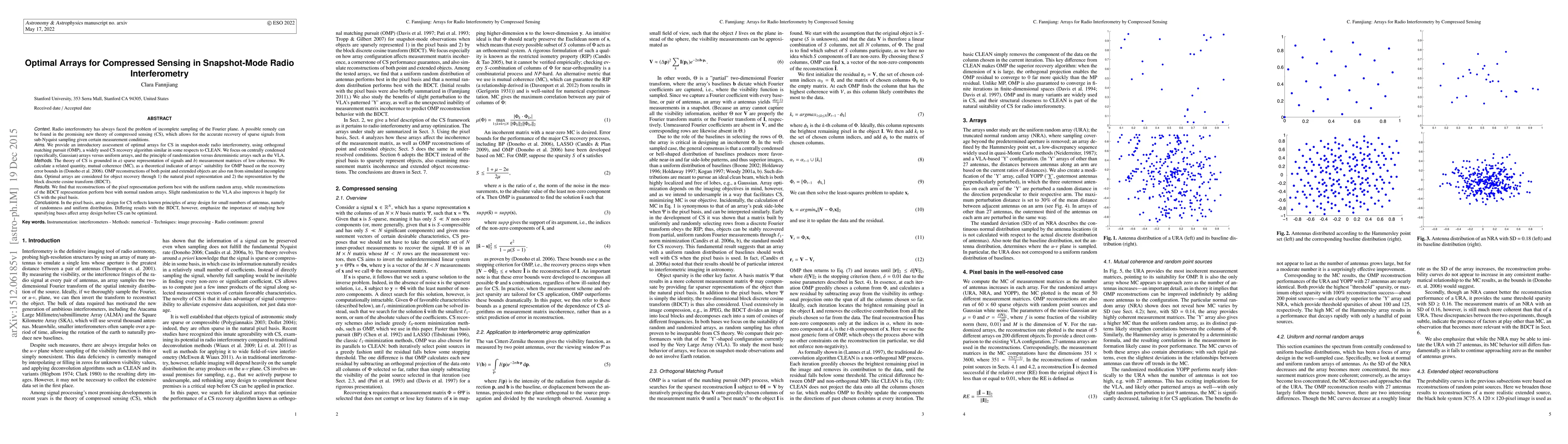 Researchers studied optimal arrays for compressed sensing in radio interferometry, finding that uniform random arrays perform best with pixel representation, while normal random arrays improve results when using block discrete cosine transform.