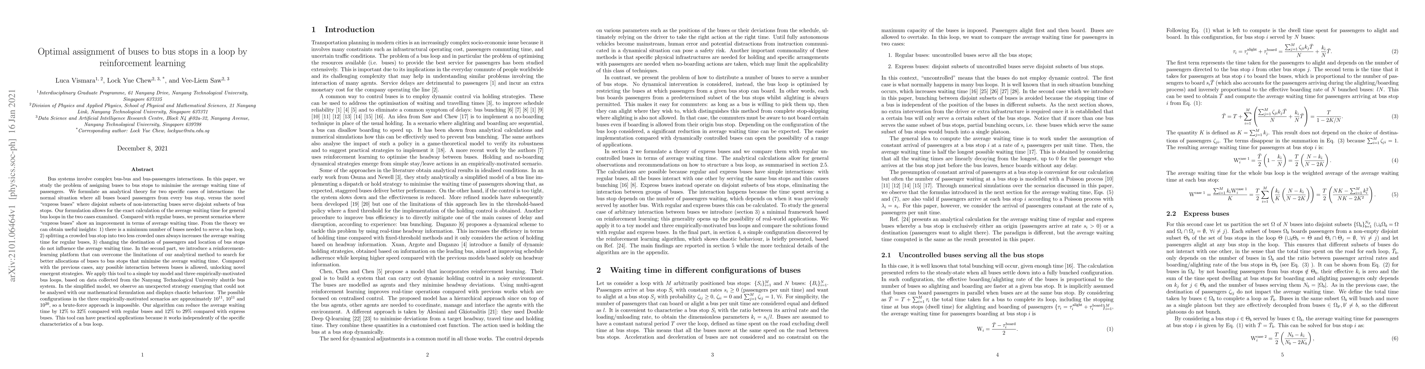 Bus systems involve complex bus-bus and bus-passengers interactions. We study the problem of assigning buses to bus stops to minimise the average waiting time of passengers, W. An analytical theory for two specific cases of interactions is formulated: normal situation where all buses board passengers from every bus stop, versus novel express buses where disjoint subsets of non-interacting buses serve disjoint subsets of bus stops. Our formulation allows exact calculation of W for general loops in the two cases examined. Compared with regular buses, we present scenarios where express buses show improvement in W. Useful insights are obtained from our theory: 1) there is a minimum number of buses needed, 2) splitting a crowded bus stop into two less crowded ones always increases W for regular buses, 3) changing the destination of passengers and location of bus stops do not influence W. In the second part, we introduce a reinforcement-learning platform that overcomes limitations of our analytical method to search for better allocations of buses to bus stops that minimise W. Compared with the previous cases, any possible interaction between buses is allowed, unlocking novel emergent strategies. We apply this tool to a simple toy model and three empirically-motivated bus loops, based on data collected from the Nanyang Technological University shuttle bus system. In the simplified model, we observe an unexpected strategy emerging that could not be analysed with our mathematical formulation and displays chaotic behaviour. The possible configurations in the three empirically-motivated scenarios are approximately 10^11, 10^11 and 10^20, so a brute-force approach is impossible. Our algorithm reduces W by 12% to 32% compared with regular buses and 12% to 29% compared with express buses. This tool has practical applications because it works independently of the specific characteristics of a bus loop.