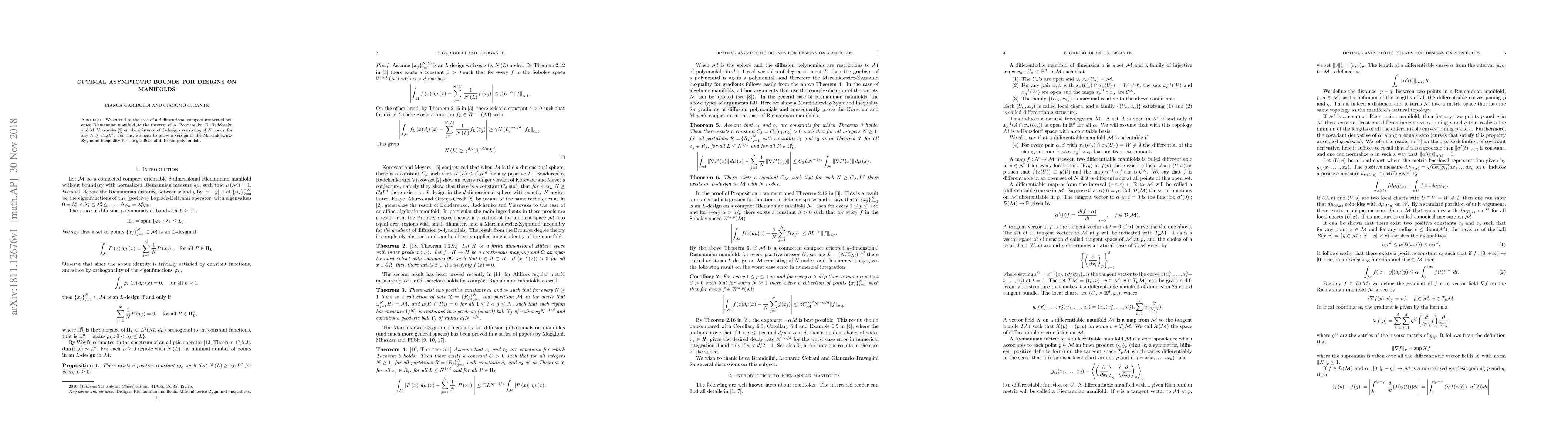 We extend to the case of a $d$-dimensional compact connected oriented Riemannian manifold $\mathcal M$ the theorem of A. Bondarenko, D. Radchenko and M. Viazovska on the existence of $L$-designs consisting of $N$ nodes, for any $N\ge C_{\mathcal M} L^d$. For this, we need to prove a version of the Marcinkiewicz-Zygmund inequality for the gradient of diffusion polynomials.