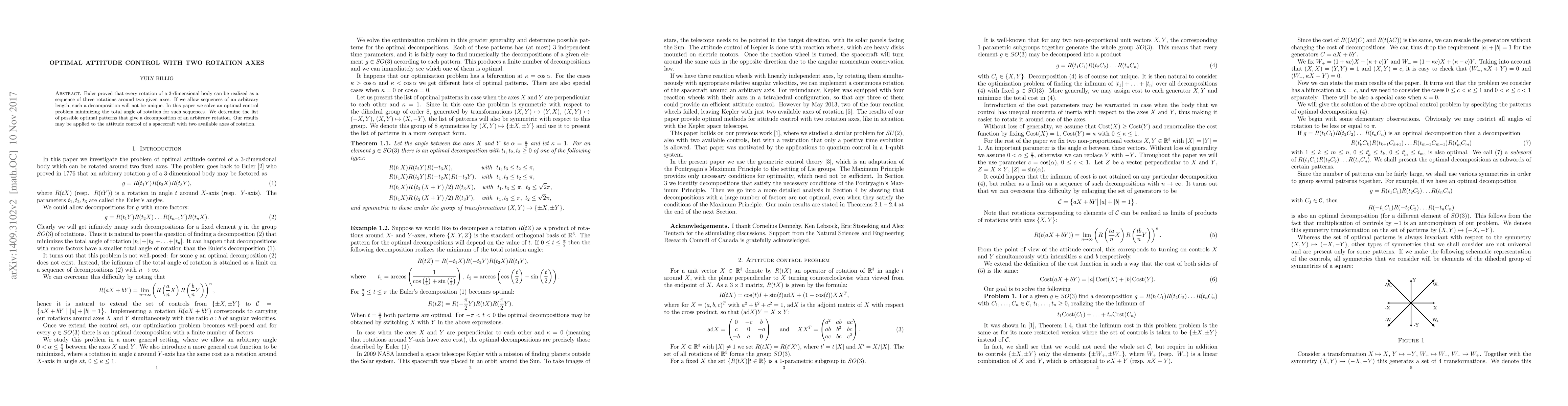 This paper solves an optimal control problem for decomposing 3D rotations into sequences of rotations around two axes, minimizing total rotation angle. Results can optimize spacecraft attitude control using two rotation axes.