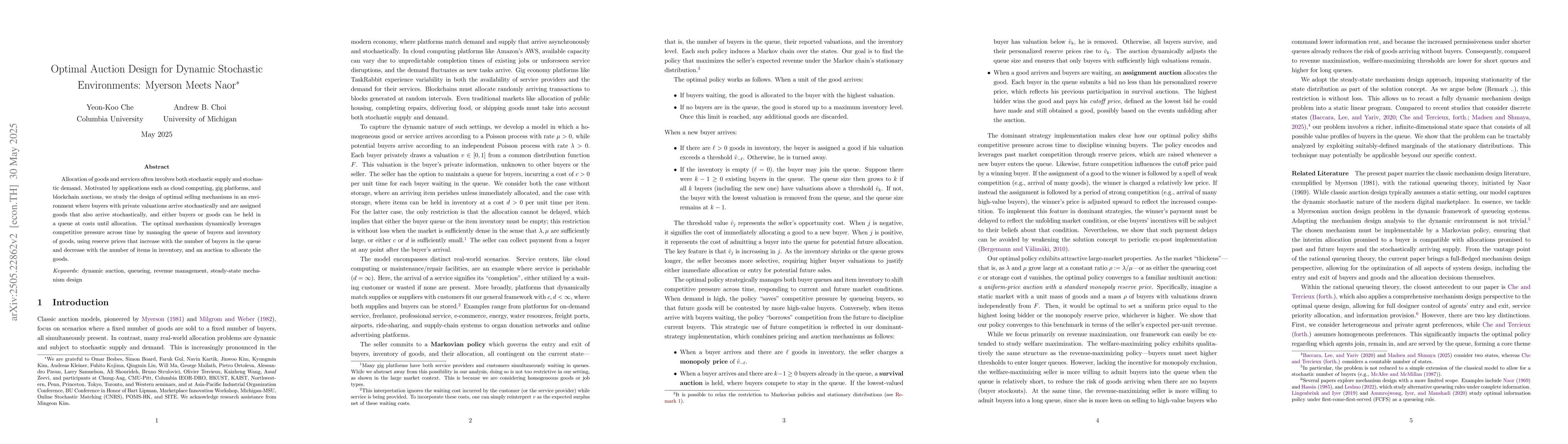 The paper presents a novel approach to optimal auction design that dynamically adjusts reserve prices based on queue and inventory states, ensuring efficient allocation in stochastic environments.