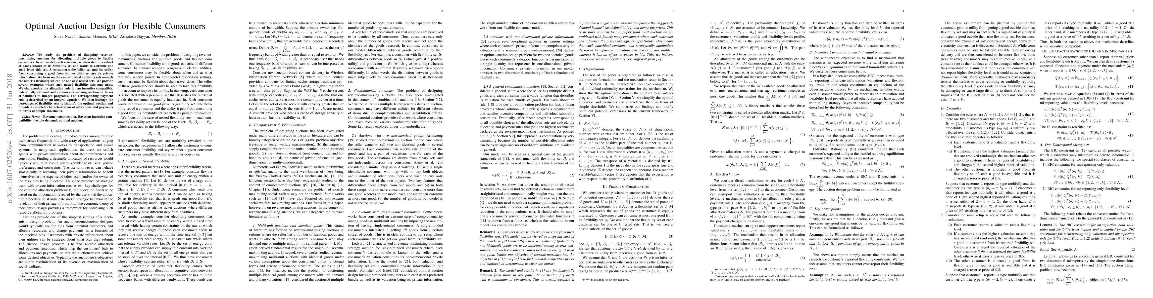 The paper studies the problem of designing revenue-maximizing auctions for allocating multiple goods to flexible consumers, focusing on nested flexibility sets where each consumer's flexibility set can be one of k nested sets.