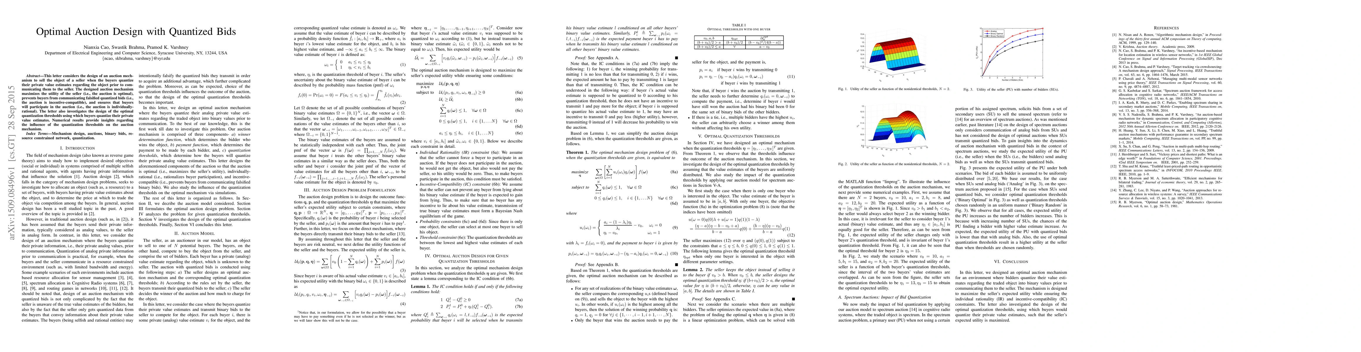 This paper designs an auction mechanism for selling an object where buyers quantize their private value estimates before bidding, aiming to maximize the seller's utility while ensuring incentive compatibility and individual rationality. It also explores optimal quantization thresholds and provides numerical insights on their impact on the auction's performance.