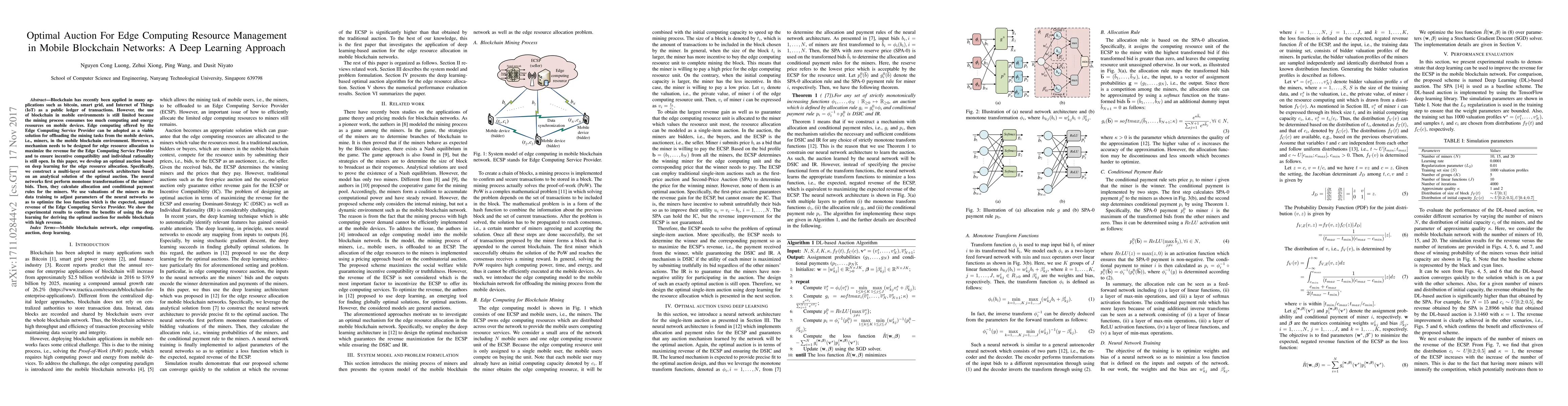 This paper proposes a deep learning-based optimal auction mechanism for edge computing resource management in mobile blockchain networks. It utilizes a multi-layer neural network to derive allocation and payment rules, optimizing the Edge Computing Service Provider's revenue through training on miners' valuations.