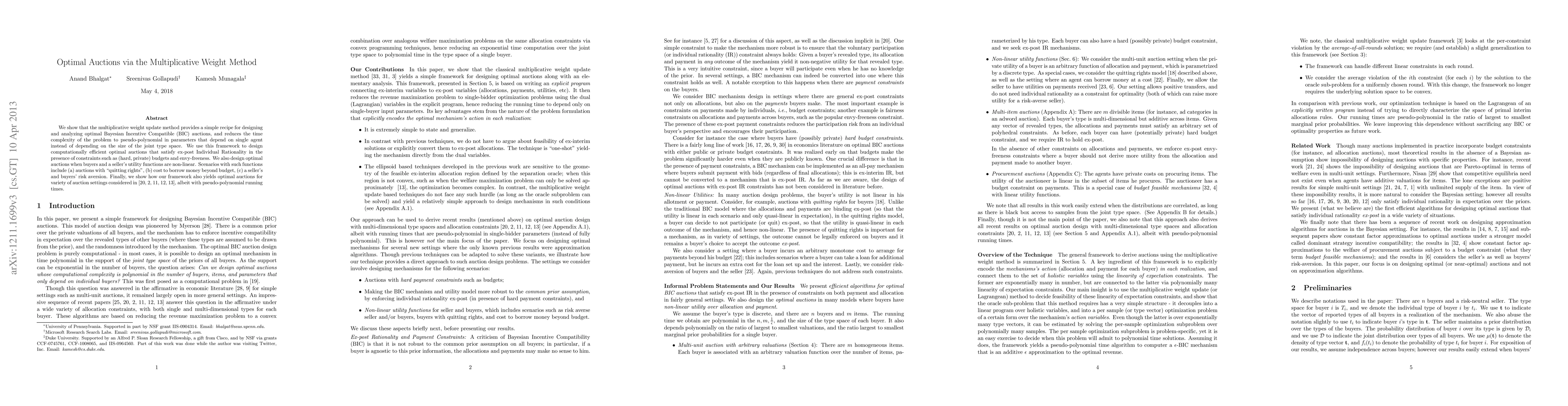 This paper demonstrates that the multiplicative weight method simplifies the design and analysis of optimal Bayesian Incentive Compatible auctions, reducing time complexity to pseudo-polynomial in terms of individual agent parameters. It also presents efficient auctions satisfying ex-post Individual Rationality under constraints like budgets and envy-freeness, and handles non-linear utility functions in scenarios such as quitting rights and risk aversion.