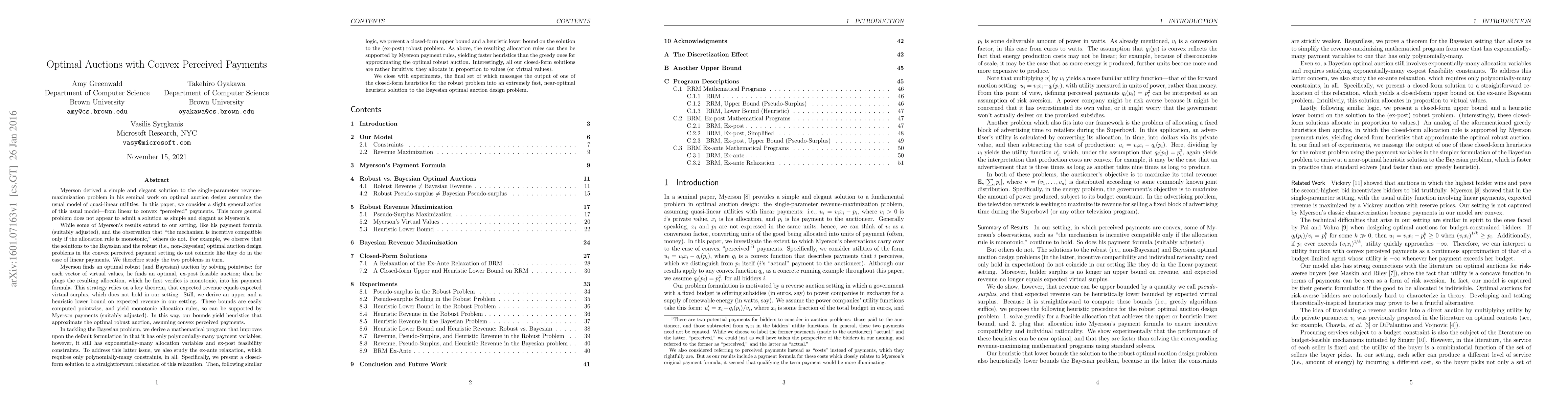 The paper extends Myerson's work on optimal auctions to a model with convex perceived payments, analyzing both robust and Bayesian settings, and develops bounds and closed-form solutions for revenue maximization.