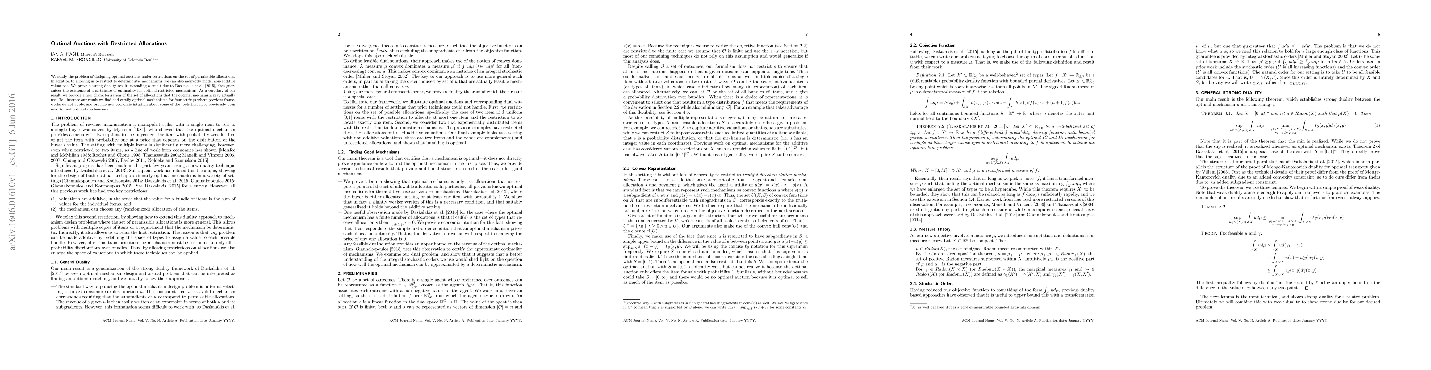 The paper proves a strong duality result for designing optimal auctions under restricted allocations, providing a new characterization of the set of allocations that the optimal mechanism may use. It also certifies optimal mechanisms for four settings where previous frameworks do not apply.