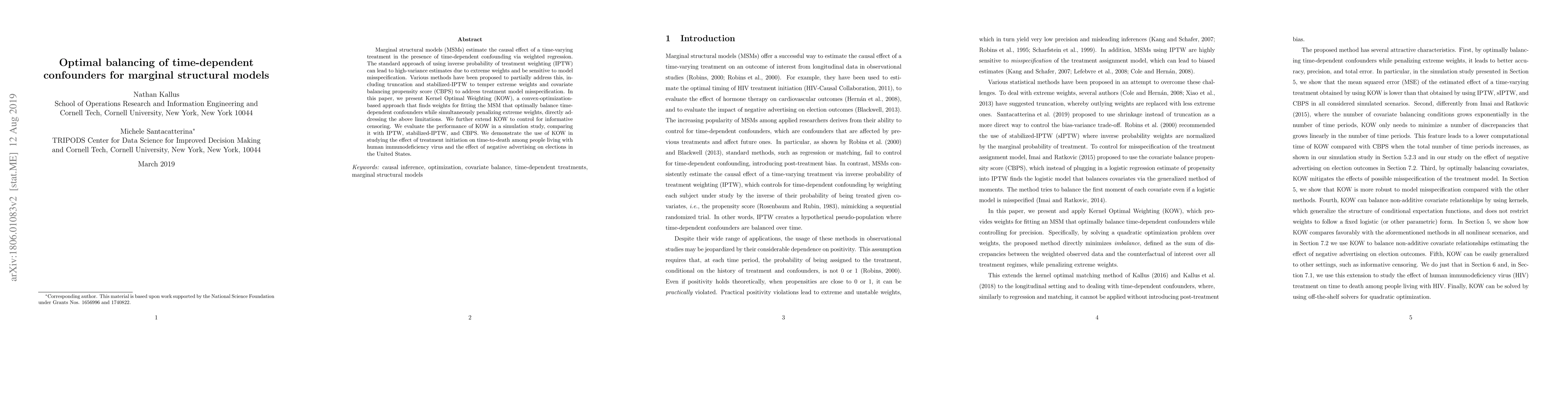 This paper introduces Kernel Optimal Weighting (KOW), a convex-optimization-based method for marginal structural models that optimally balances time-dependent confounders while controlling for precision, addressing limitations of existing methods like IPTW. KOW is evaluated against other methods in simulations and applied to real-world scenarios like treatment effects in HIV and political advertising impacts.