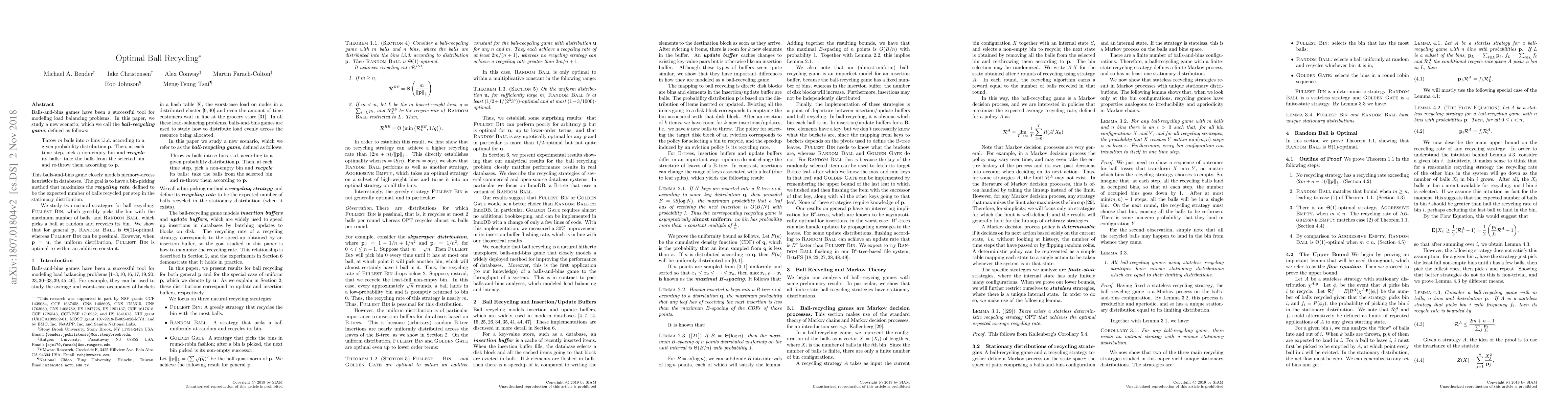 Balls-and-bins games have been a wildly successful tool for modeling load balancing problems. In this paper, we study a new scenario, which we call the ball recycling game, defined as follows: Throw m balls into n bins i.i.d. according to a given probability distribution p. Then, at each time step, pick a non-empty bin and recycle its balls: take the balls from the selected bin and re-throw them according to p. This balls-and-bins game closely models memory-access heuristics in databases. The goal is to have a bin-picking method that maximizes the recycling rate, defined to be the expected number of balls recycled per step in the stationary distribution. We study two natural strategies for ball recycling: Fullest Bin, which greedily picks the bin with the maximum number of balls, and Random Ball, which picks a ball at random and recycles its bin. We show that for general p, Random Ball is constant-optimal, whereas Fullest Bin can be pessimal. However, when p = u, the uniform distribution, Fullest Bin is optimal to within an additive constant.