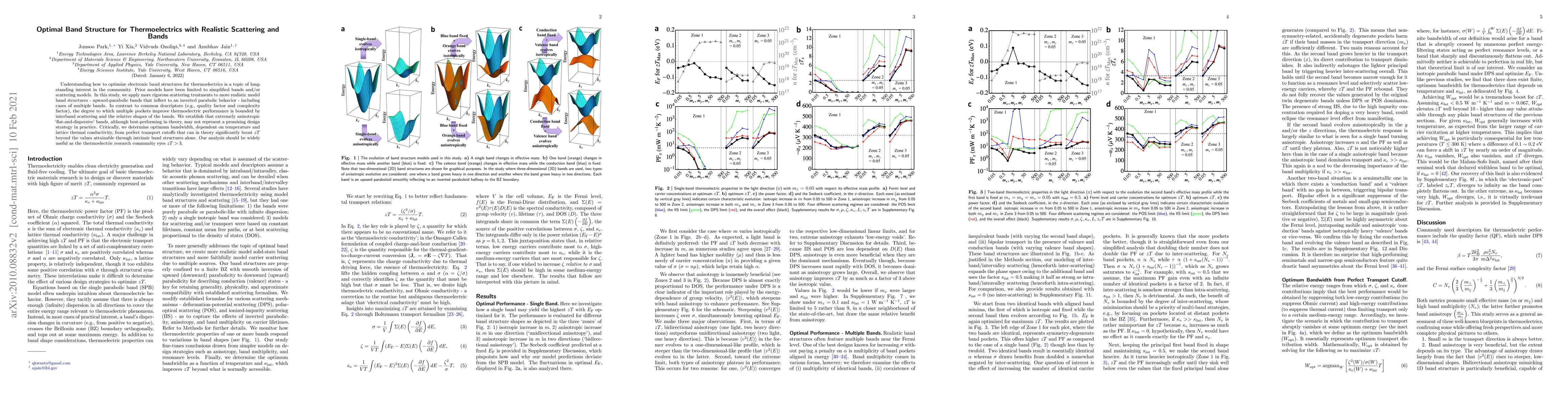 Understanding how to optimize electronic band structures for thermoelectrics is a topic of long-standing interest in the community. Prior models have been limited to simplified bands and/or scattering models. In this study, we apply more rigorous scattering treatments to more realistic model band structures - upward-parabolic bands that inflect to an inverted parabolic behavior - including cases of multiple bands. In contrast to common descriptors (e.g., quality factor and complexity factor), the degree to which multiple pockets improve thermoelectric performance is bounded by interband scattering and the relative shapes of the bands. We establish that extremely anisotropic `flat-and-dispersive' bands, although best-performing in theory, may not represent a promising design strategy in practice. Critically, we determine optimum bandwidth, dependent on temperature and lattice thermal conductivity, from perfect transport cutoffs that can in theory significantly boost $zT$ beyond the values attainable through intrinsic band structures alone. Our analysis should be widely useful as the thermoelectric research community eyes $zT>3$.