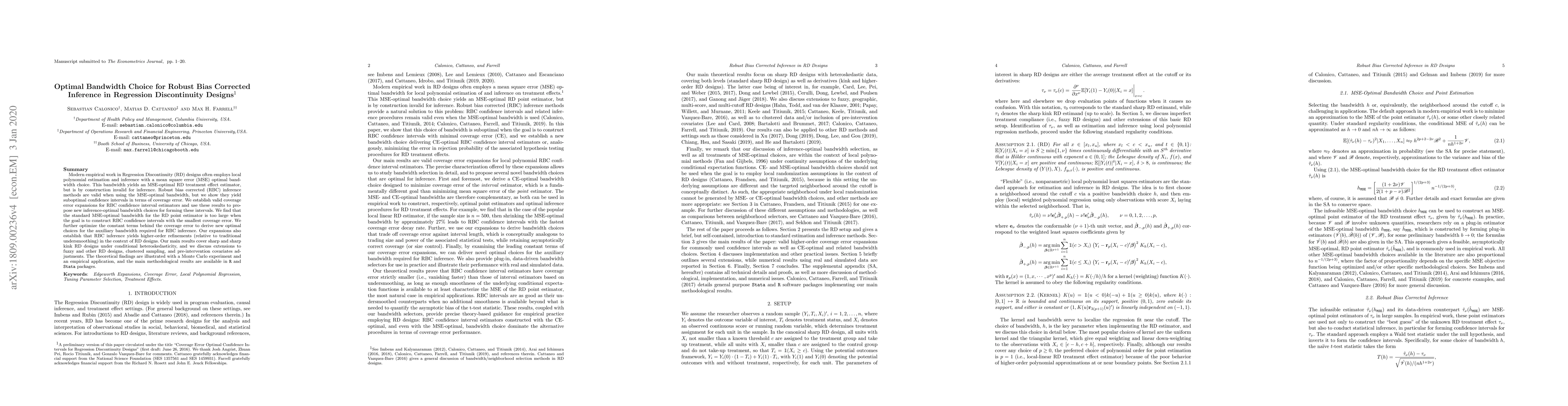 This paper proposes new inference-optimal bandwidth choices for robust bias corrected inference in Regression Discontinuity designs, showing that the standard MSE-optimal bandwidth is too large for minimizing coverage error. The authors develop valid coverage error expansions and introduce new bandwidths that optimize for the smallest coverage error, offering higher-order refinements compared to traditional methods.
