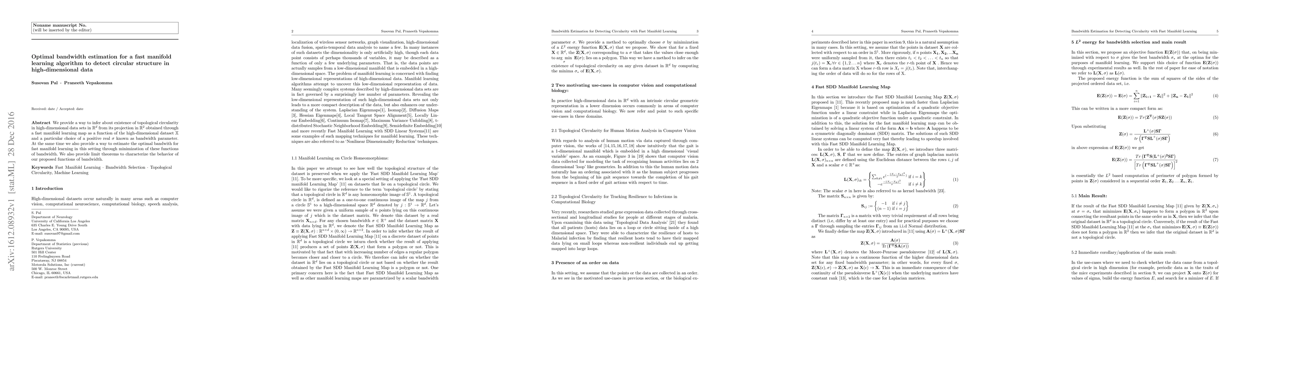 We provide a way to infer about existence of topological circularity in high-dimensional data sets in $\mathbb{R}^d$ from its projection in $\mathbb{R}^2$ obtained through a fast manifold learning map as a function of the high-dimensional dataset $\mathbb{X}$ and a particular choice of a positive real $\sigma$ known as bandwidth parameter. At the same time we also provide a way to estimate the optimal bandwidth for fast manifold learning in this setting through minimization of these functions of bandwidth. We also provide limit theorems to characterize the behavior of our proposed functions of bandwidth.