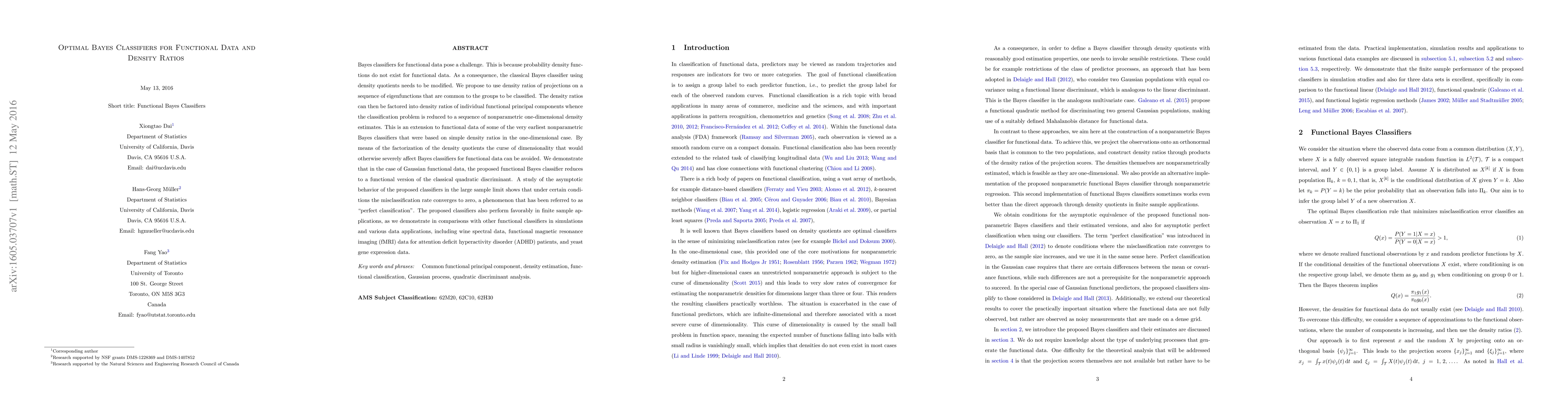 This paper proposes a novel Bayes classifier for functional data that avoids the curse of dimensionality by using density ratios of projections on eigenfunctions. The method factors density quotients into one-dimensional nonparametric estimates, achieving "perfect classification" in large samples and performing well in finite sample applications across various datasets.