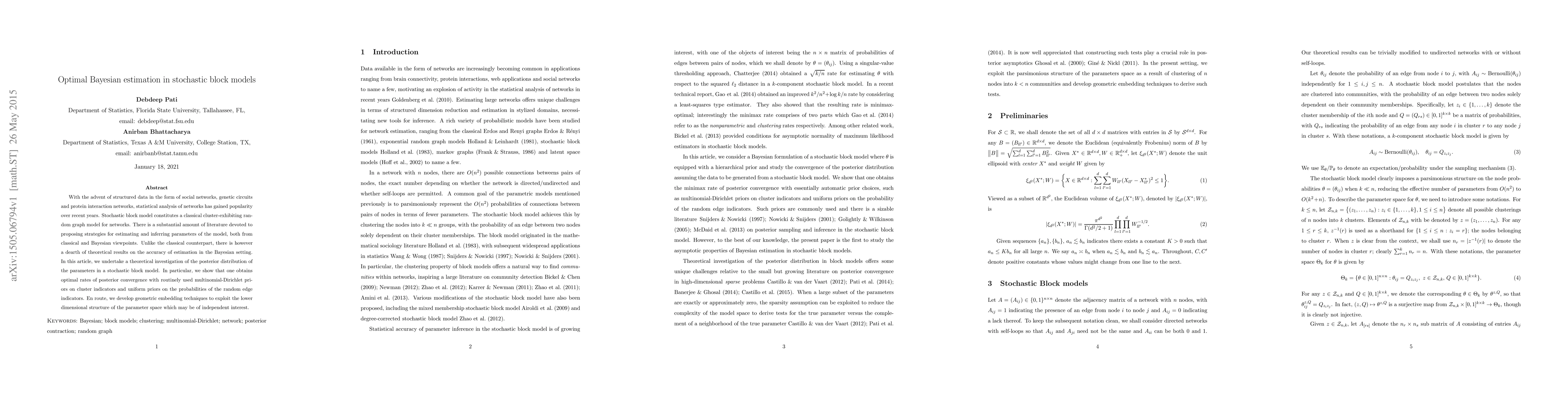 This paper investigates optimal Bayesian estimation in stochastic block models, demonstrating that commonly used multinomial-Dirichlet priors and uniform priors yield optimal rates of posterior convergence. The study also introduces geometric embedding techniques to exploit the parameter space's lower dimensional structure.