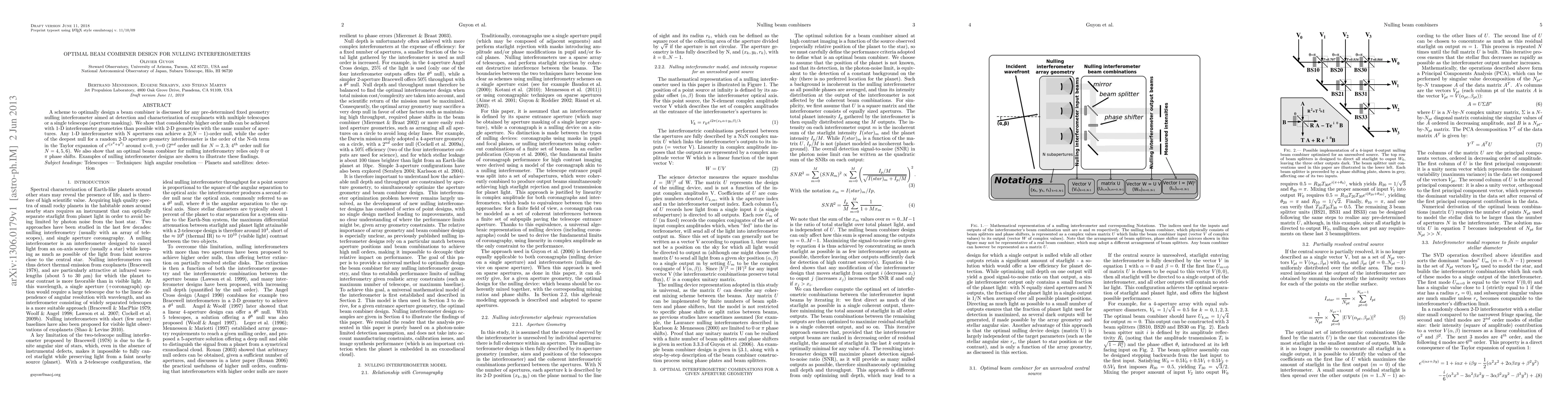 This paper proposes an optimal beam combiner design for nulling interferometers, demonstrating that 1-D geometries achieve higher order nulls than 2-D geometries with the same number of apertures. It concludes that an optimal beam combiner relies on 0 or Pi phase shifts.