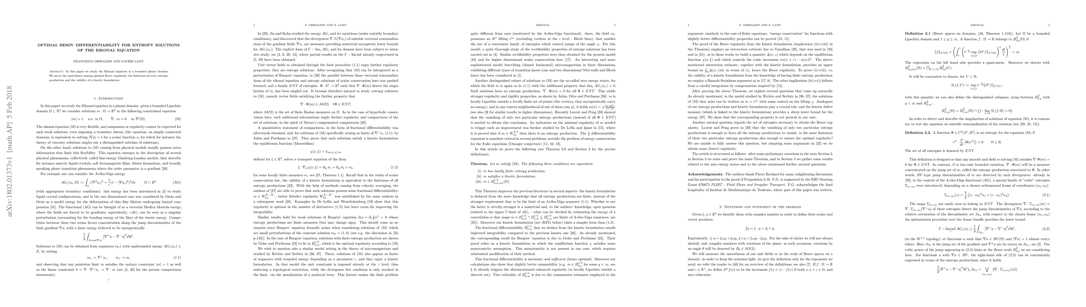 Researchers study the Eikonal equation in a bounded planar domain to prove equivalence among optimal Besov regularity, entropy production, and kinetic formulation, leading to new insights into its solvability.